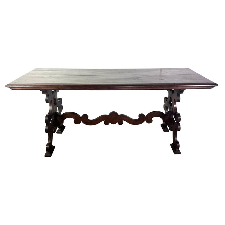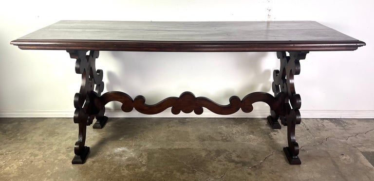 19th-century Italian Baroque style console table, standing on two pedestals made from scrolls and connected by a center stretcher in a coordinating motif, represents a dramatic and ornate piece characteristic of the Baroque period. Crafted from walnut, a wood prized for its deep, rich hues and durability, this console table showcases a beautiful patina that adds to its antique charm and visual depth.