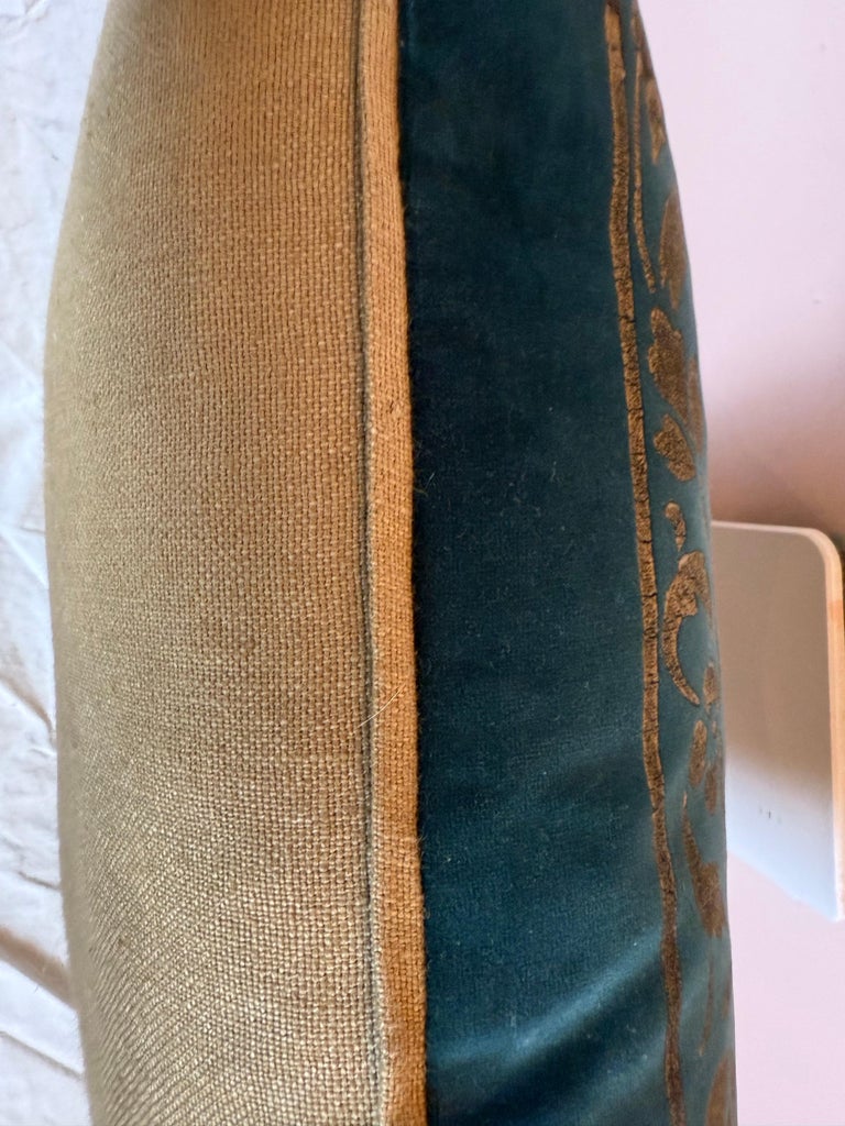 This luxurious decorative pillow by Nomi Textiles features a richly stenciled velvet design that exudes opulence and old-world charm. The base fabric is a deep, jewel-toned green velvet, soft to the touch and visually plush. The surface is adorned with an intricate gold stenciled damask pattern, featuring scrolling acanthus leaves, floral motifs, and classical ornamental flourishes. The gold stencil work catches the light beautifully, adding a touch of shimmer and regal elegance. The pillow has a structured rectangular shape with piped edges that give it a clean, finished look. This piece would work beautifully as a statement accent on a vintage sofa, a moody velvet armchair, or layered among other rich textiles in an eclectic or maximalist interior. Nomi Textiles is known for its handcrafted approach and attention to historic decorative techniques, and this pillow exemplifies that ethos—blending artisanal quality with theatrical beauty.
