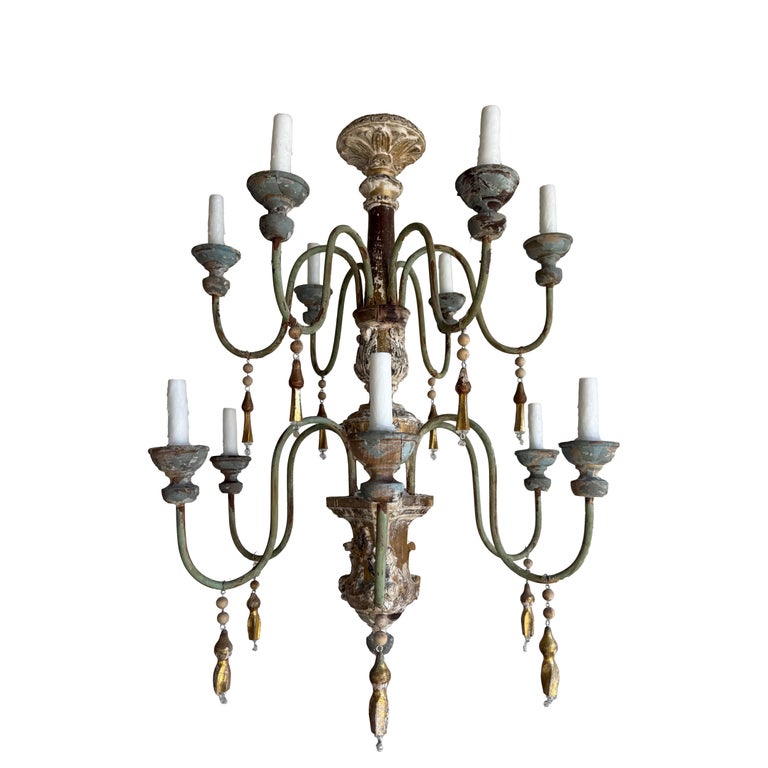 A spectacular Italian painted and giltwood chandelier, early 20th century, in the Baroque and Rococo revival taste. This large twelve-light fixture features a carved and turned central column with traces of original polychrome paint and parcel gilding, beautifully distressed to reveal layers of history. The richly textured surface shows areas of gilt sunburst and foliate motifs, lending depth and authenticity. Scrolled iron arms extend gracefully from the column, each terminating in carved wooden candle cups painted in soft shades of celadon and muted blue. The chandelier is further ornamented with suspended giltwood drops and bead elements, creating movement and an aged elegance. The overall composition is both rustic and regal—equally suited for a grand villa, château dining hall, or as a striking statement piece in a modern interior with Old-World contrast. The chandelier is newly rewired with real drip wax candle covers. It includes chain and canopy.