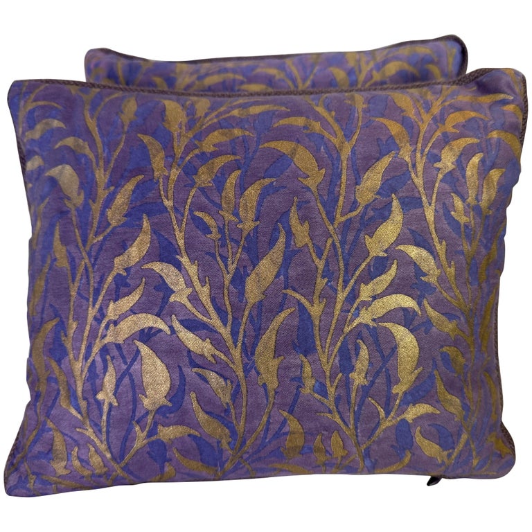 These Fortuny pillows feature a luxurious and elegant design typical of the brand’s signature aesthetic. The fabric displays a bold, flowing vine and leaf motif in a rich gold tone, set against a deep purple background with hints of blue undertones. The gold appears to be applied in a slightly metallic or gilt finish, catching the light and enhancing the fabric’s dimensional quality. This design is likely the “Glicine” pattern, known for its stylized botanical forms with an Art Nouveau influence. The colorway appears to be Gold on Violet, which is a classic Fortuny combination known for its opulence and dramatic contrast. The edges are simply finished, letting the fabric and pattern take center stage. These pillows would be perfect in a formal living space, adding a refined touch with a hint of old-world Venetian glamour.