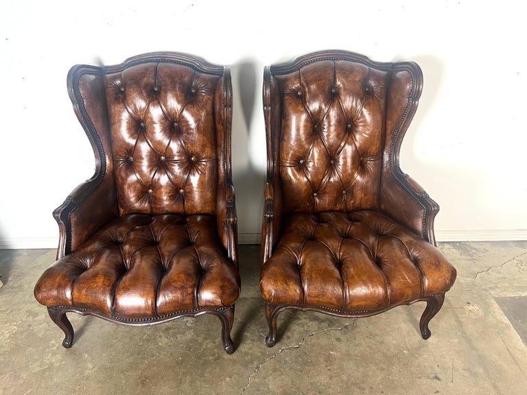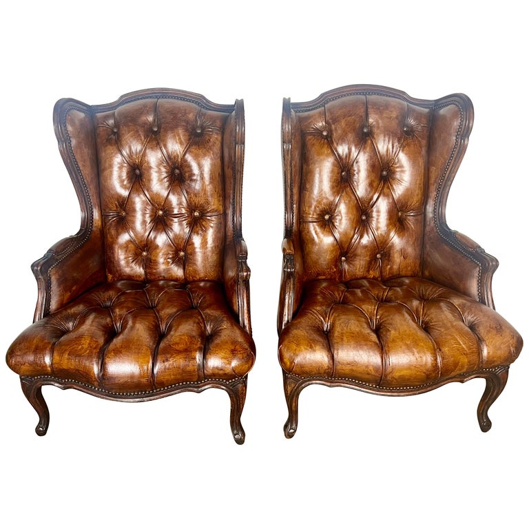 Pair of leather tufted wingback armchairs. The chairs are upholstered in a rich brown tufted leather with nailhead trim detail.  The armrests are gently curved and upholstered, matching the overall leather design.  The chairs have elegantly carved wooden legs that taper slightly at the bottom, giving a refined look.