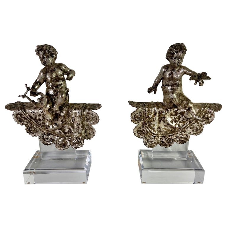 Pair of French Silvered Gilt Metal Cherubs on Lucite Bases