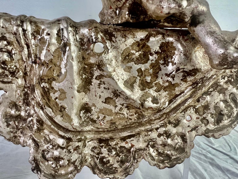 Pair of silvered gilt metal architectural elements depicting cherubs. The cherubs are mounted on a lucite base and are ready for your home.