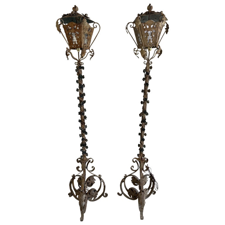 These are a pair of vintage wrought iron floor lanterns with an ornate and rustic aesthetic. The design features intricate scrollwork and floral motifs, including rose accents climbing up the slender stems. The lanterns have a weathered, aged patina with visible rust and chipping, giving them a charming antique appearance. Each lantern is supported by a sturdy, decorative tripod base adorned with curved details and floral embellishments. The top portion showcases a lantern-style light fixture with cut-out patterns, allowing light to filter through stylishly. The metal framework has a mix of curved and angular elements, giving the lanterns a sophisticated, old-world European feel. These pieces would make stunning decorative elements in a garden, patio, or vintage-inspired interior space.