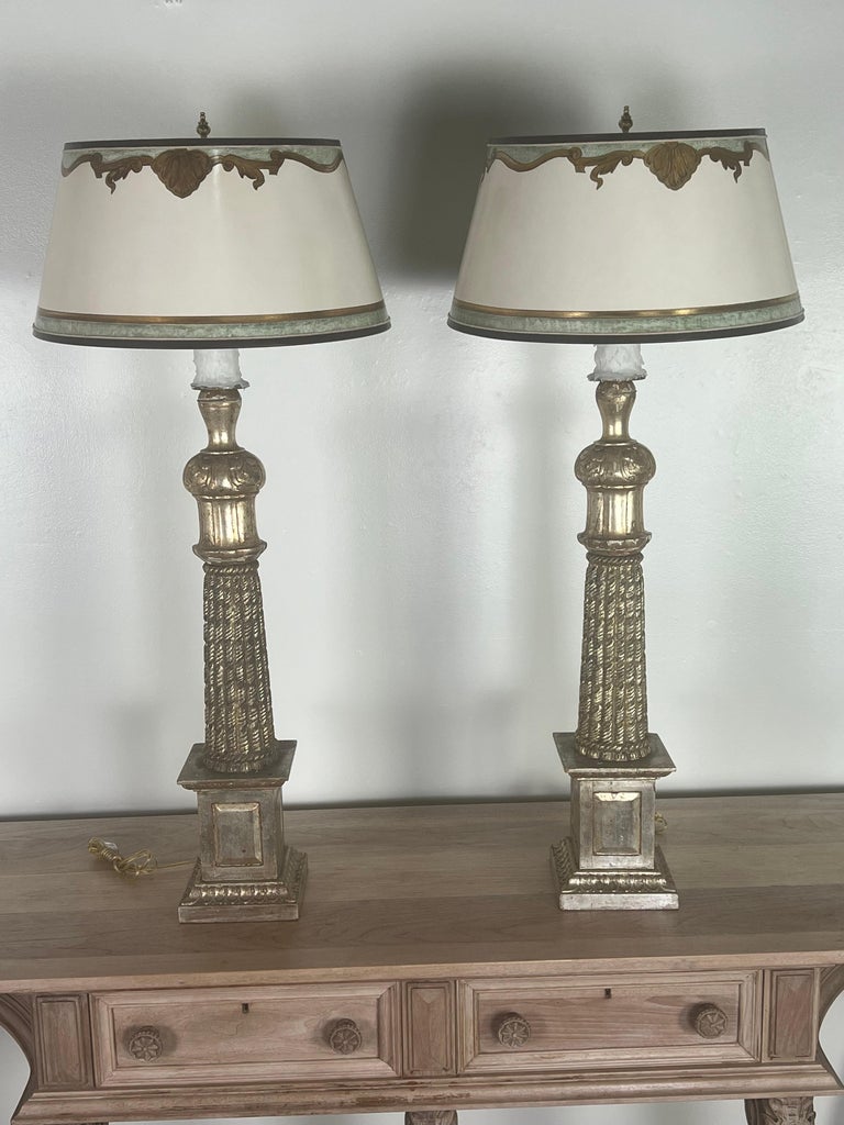 Pair of Monumental size beautifully carved Italian Neoclassical style silvered lamps. The lamps have custom hand painted parchment shades. The lamps are newly wired with drip wax candle covers. They are ready to use.