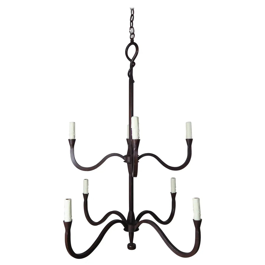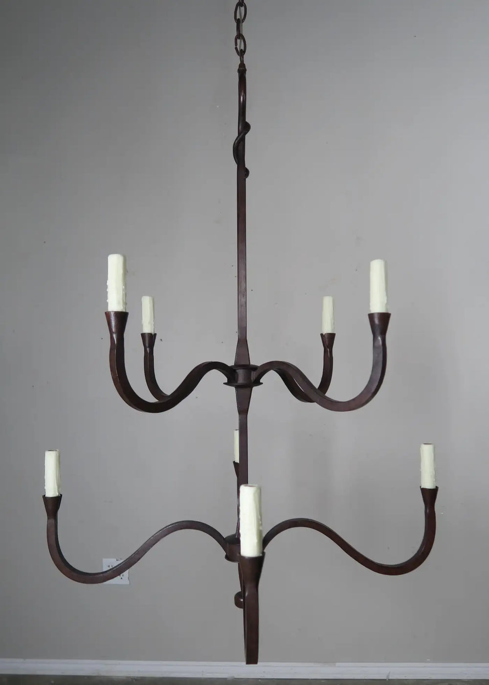 Two-tier eight light hand wrought iron chandelier finished in an antique iron finish. The chandelier is newly wired with cream drip wax candle covers. The chandelier is made in two sizes but any size or custom finish can be done per your specifications. Custom sizes, and finishes are available. We always have at least a pair in stock but if you need a larger quantity lead time is 4-6 weeks.