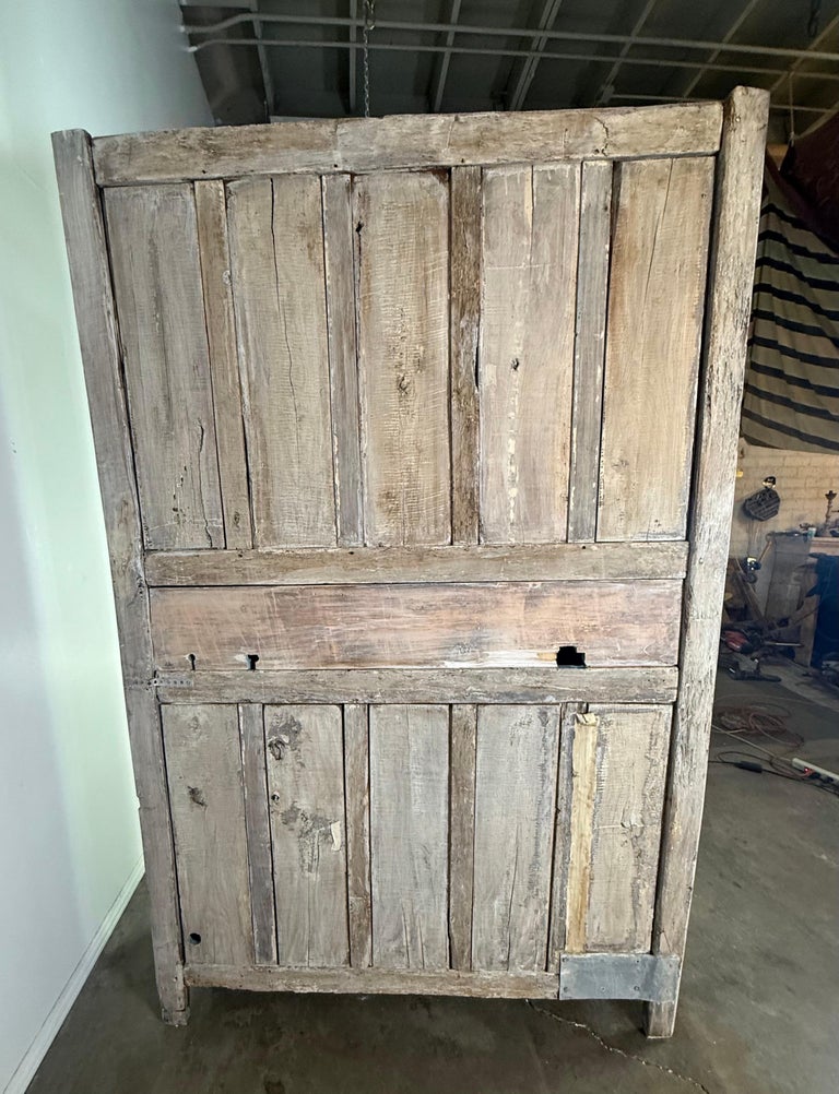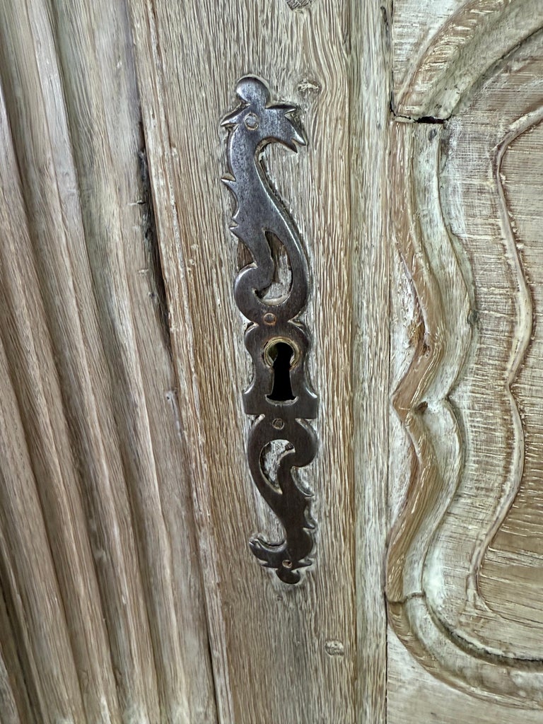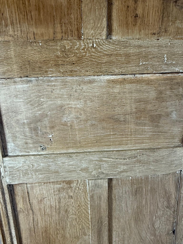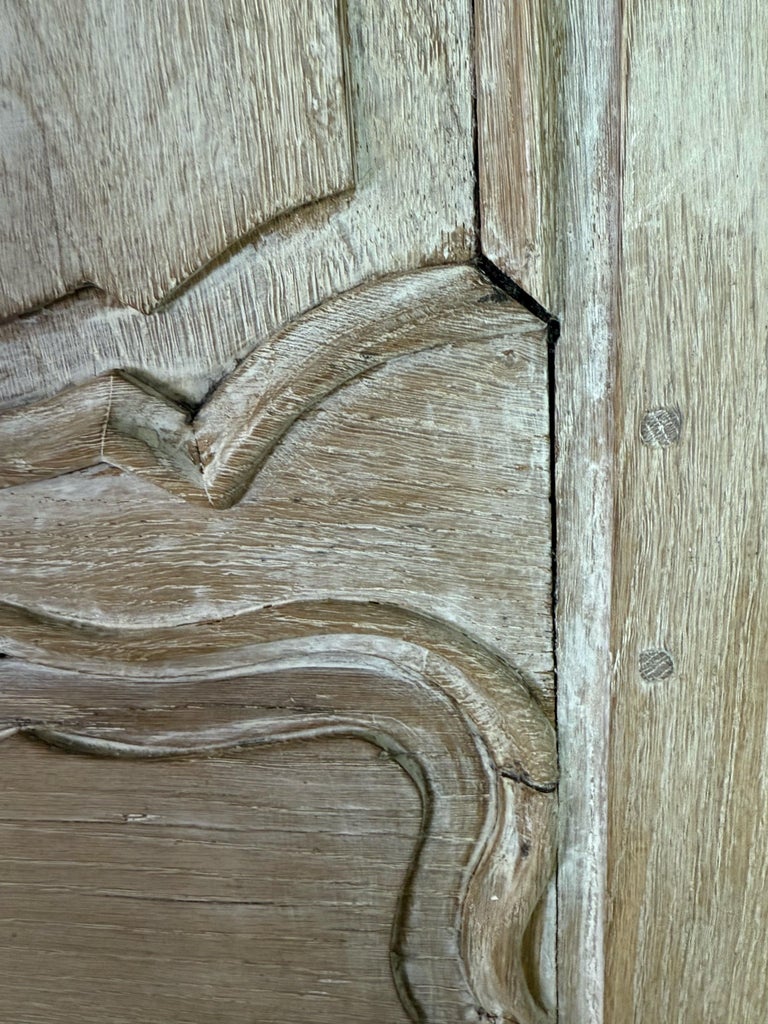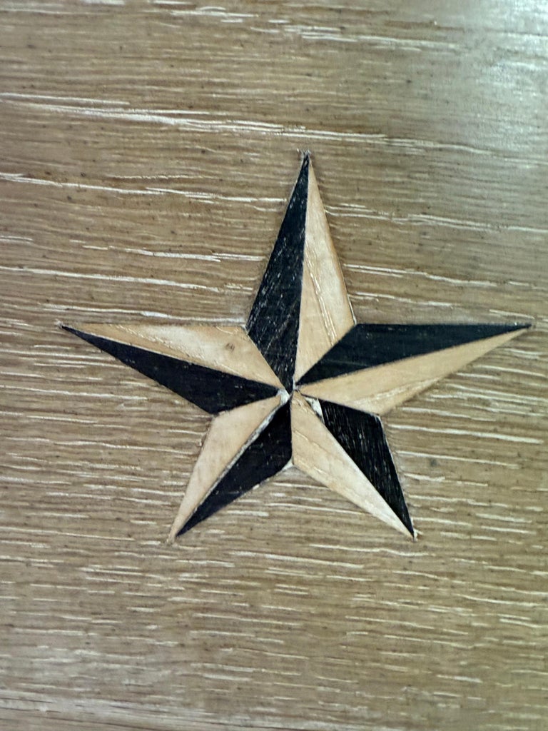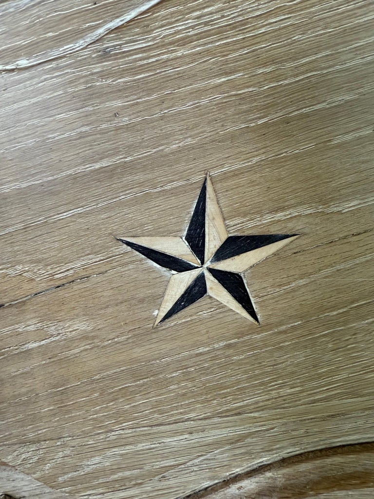 A beautifully timeworn French Provincial armoire, crafted in solid oak and retaining a richly aged, cerused surface that highlights the natural grain and centuries of use. The façade is fitted with two paneled doors featuring classic molded reserves, each centered with a hand-cut five-point star inlay in contrasting dark and light wood—a distinctive and highly decorative regional detail.