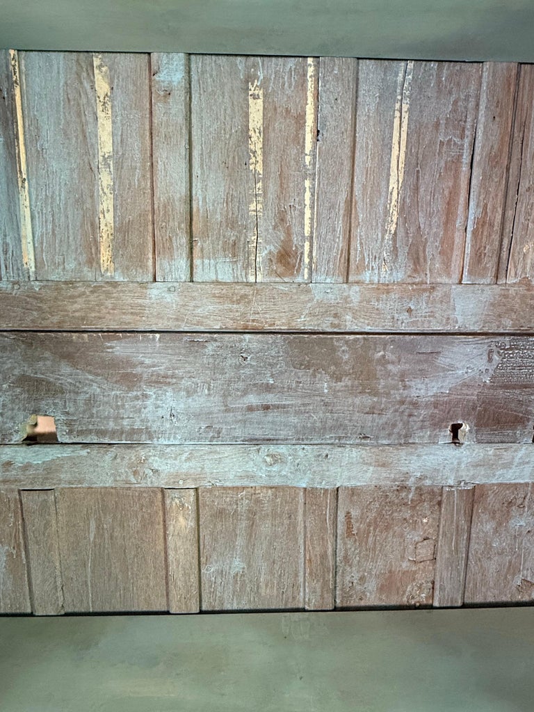 The interior opens to reveal a fully paneled back and sides with fixed shelving, finished in a soft, pale blue-green wash—likely a later historic paint layer—adding depth and character. Construction throughout reflects traditional mortise-and-tenon joinery, with visible tool marks and age splits consistent with period craftsmanship.