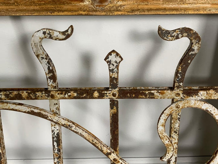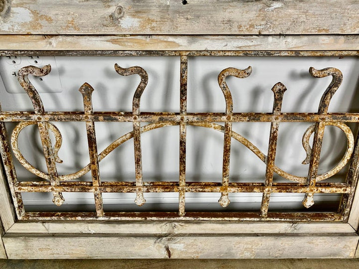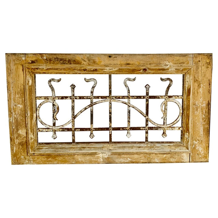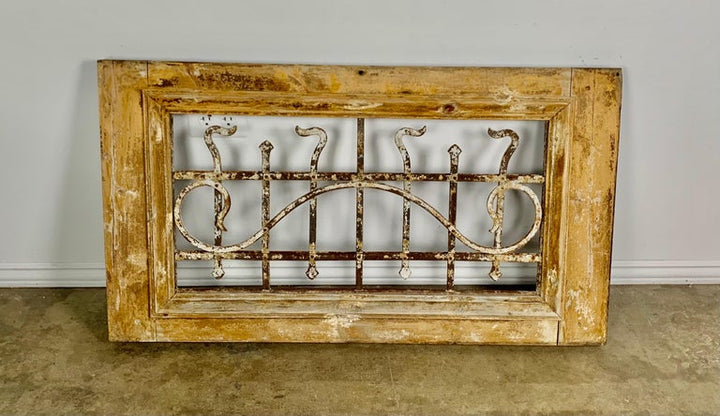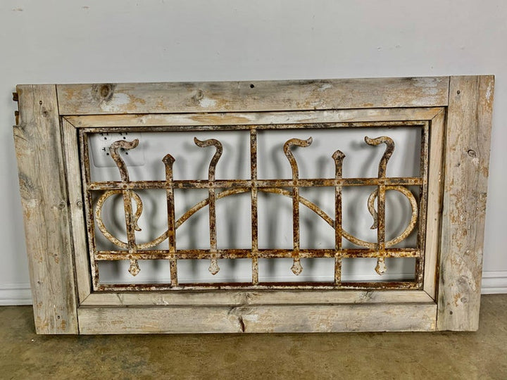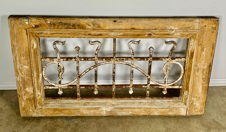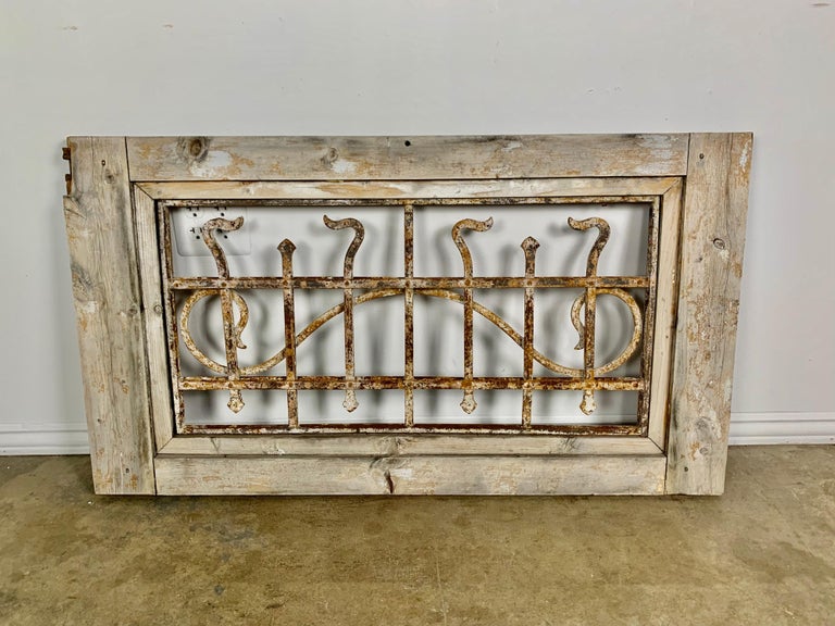 19th century panel made of a wood frame with hand wrought iron inset. Beautiful distressed paint throughout. It would be great to build into a construction project or incorporate as interesting wall decor.