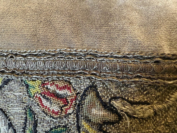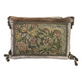 These luxurious pillows are a stunning blend of antique and contemporary craftsmanship. The front features a 19th-century metallic embroidered textile, adorned with intricate floral motifs in muted gold, green, and earth tones. The embroidery exhibits rich textures and fine detailing, evoking the opulence of historical decorative arts. Surrounding this exquisite centerpiece is a border of contemporary silk velvet, adding a plush contrast to the aged embroidery. The back of the pillow is made of smooth silk, providing a soft and elegant finish. Decorative tassels on the corners enhance the classic aesthetic, while the down inserts ensure a sumptuous and comfortable feel. These pillows embody a sophisticated fusion of antique textile artistry and modern luxury, making them a unique and timeless addition to any interior.