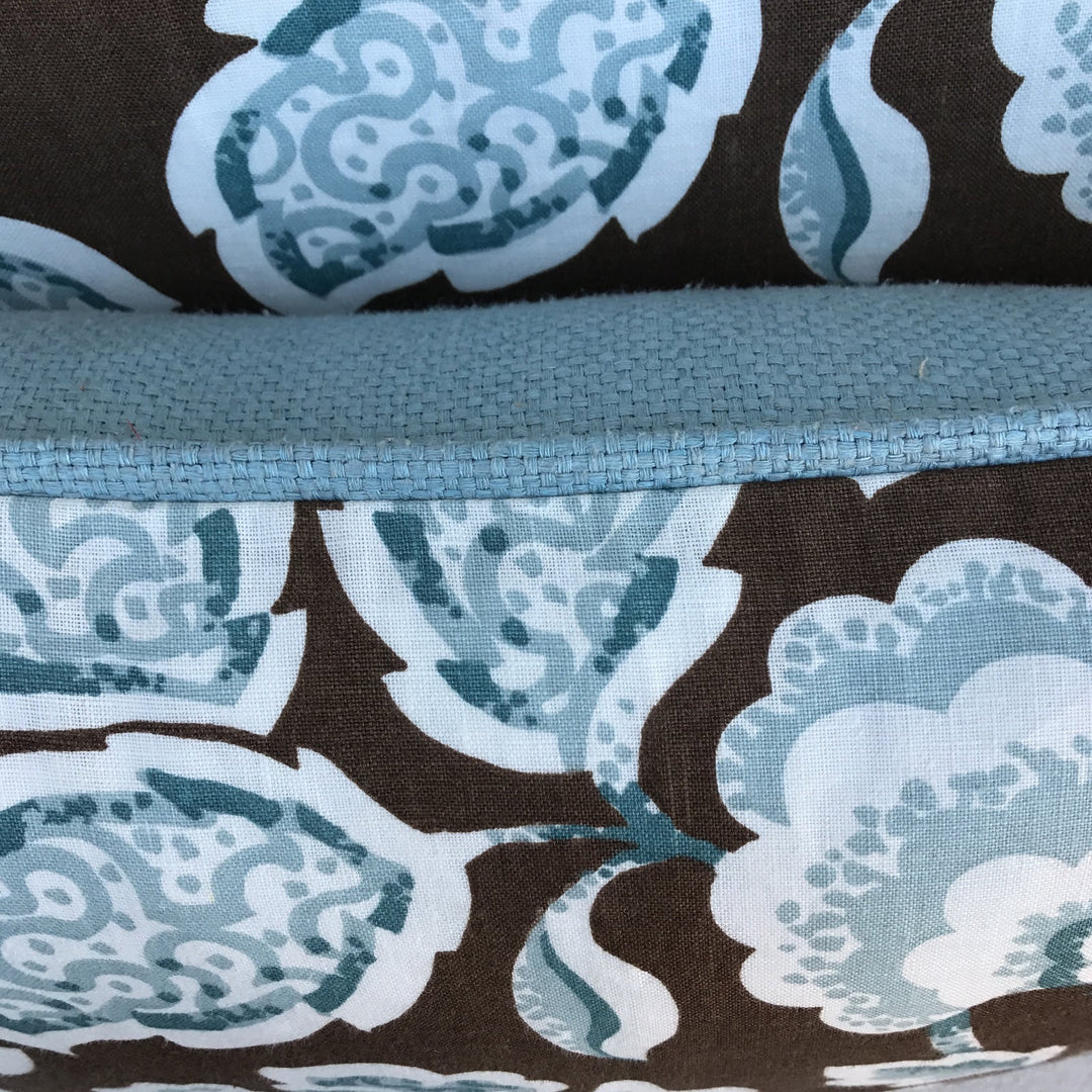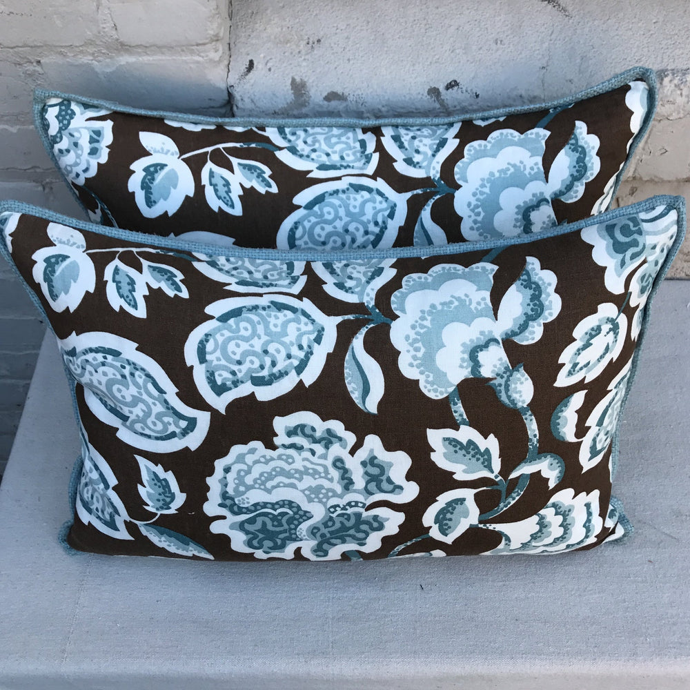 Pair of custom pillows made with a printed cotton. Blue & brown floral design with soft blue linen backs and self welt detail. Down inserts, sewn shut.