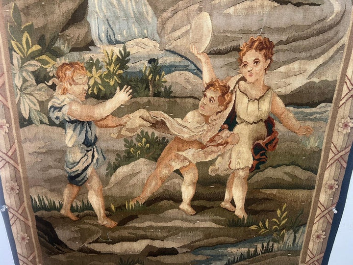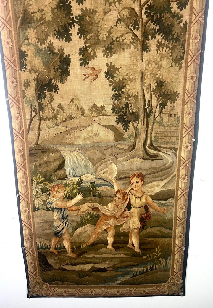 Belgium and French fine quality wall tapestries are a woven wall hanging that depicts a scene or famous painting. This tapestry features a pastoral scene. In the foreground there are a group of children playing in a field. The detailed work captures the essence of a bygone era, possibly evoking the Romantic period with its idealization of nature and country living. The tapestry is framed with a decorative border that complements the central imagery. The colors are predominantly warm, with earthy tones that contribute to the pastoral atmosphere of the scene. Trees and foliage are rendered in various shades of green, white the figure are depicted in colors that stand out against the natural background drawing the viewer's attention to the human aspect of the scene. Overall, this piece would add a touch of classical elegance and a sense of serene, bucolic charm to any space in which it is displayed. Wall tapestries were first developed in Europe to decorate castles and large churches. These tapestries are of the finest quality and are some of the most beautiful tapestries on the market today. They are widely sought by collectors and the antique world. They are woven using the finest materials and vegetable dyed threads. These fine quality tapestries are made from only quality materials and artistry making them a desirable addition to a person's home.