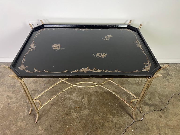 Black lacquered Chinoiserie painted tea table that stand on silvered metal legs that are connected by a bottom stretcher. There are are raised gold chinoiserie details of flowers and acanthus leaves. Good condition.