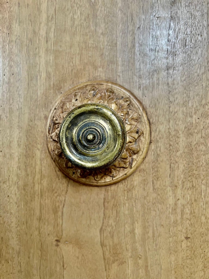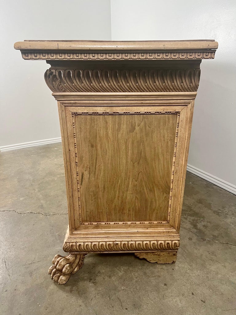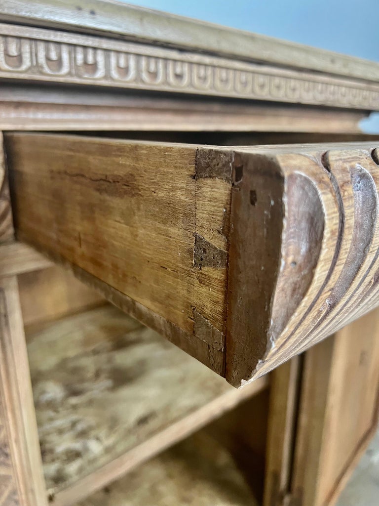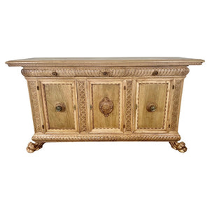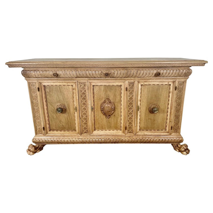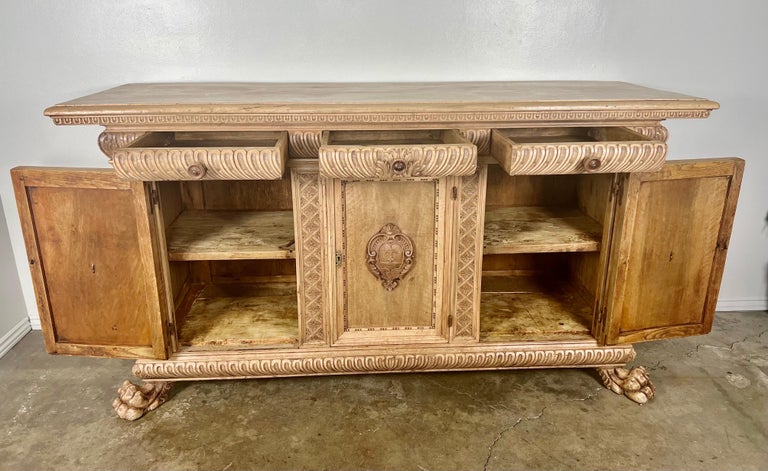 Early 19th century French Provincial carved credenza. The credenza has two working doors and three drawers for plenty of storage. The piece stands on two finely carved lion paw feet in the front. Notice the beautifully carved cartouche in the center of the piece with a fleur de lis inside. Original brass hardware knobs on drawers and cabinet doors.