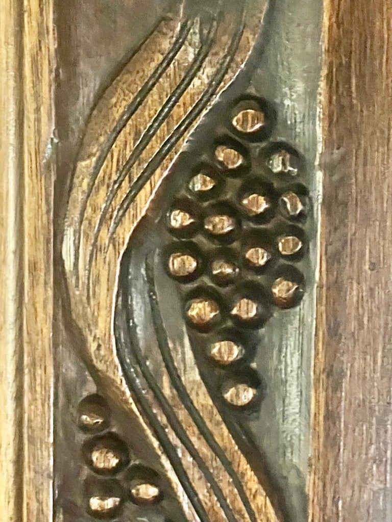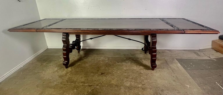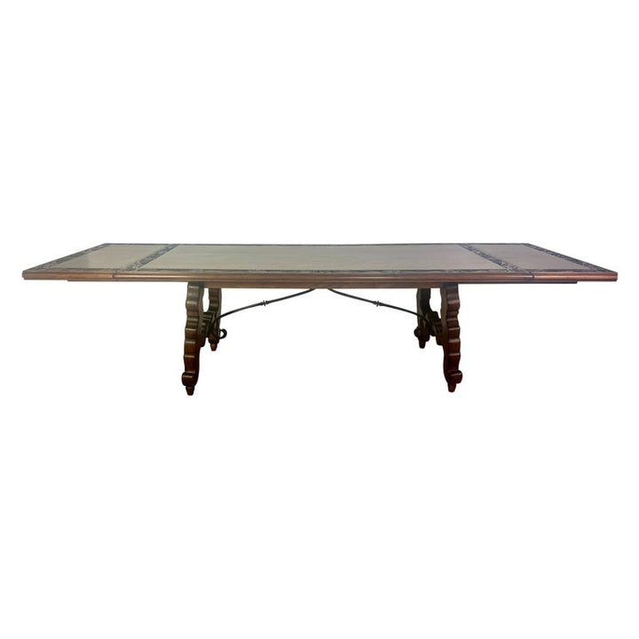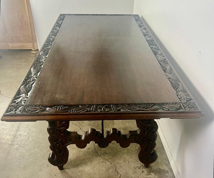 Early 20th Century Spanish refractory table with hand carved grapevines around the perimeter of the table. There are two extensions on either end that are easy to remove. This walnut table and an iron stretcher at it's base and stands on two lyre shaped pedestals.