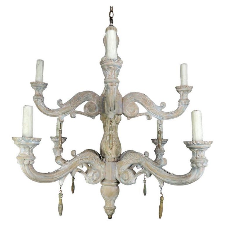 Eight-light Italian style carved wood two-tier chandelier with remnants of paint throughout. This fixture has a beautiful worn painted finish. The fixture is newly rewired with drip wax candle covers. Includes chain and canopy. A pair is available upon request.