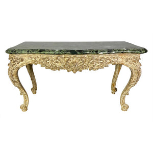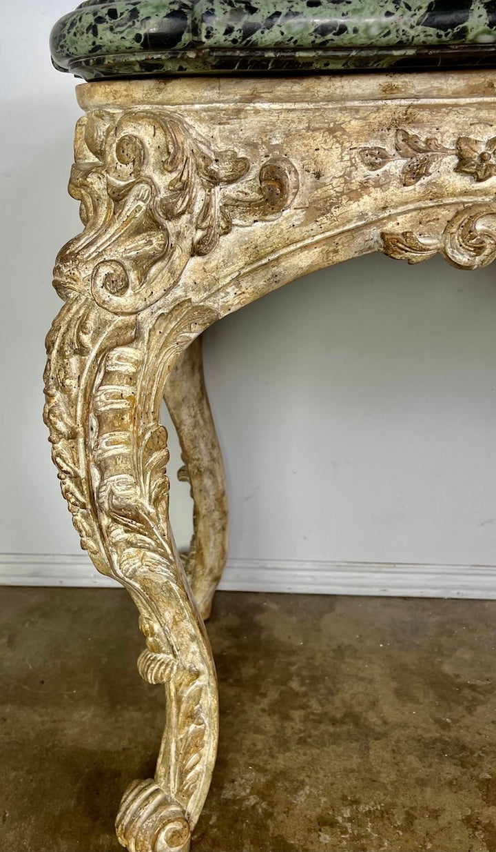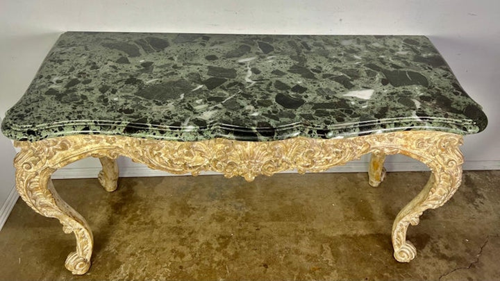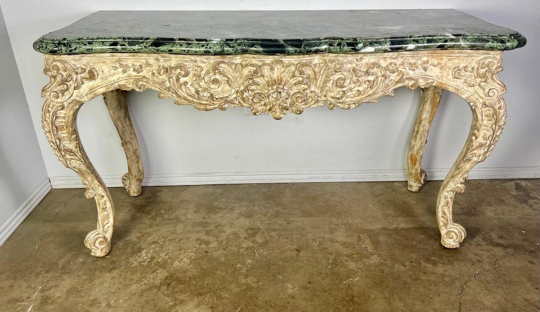 French carved Louis XV style console in a distressed painted finish. The marble top is 2" thick in a soft green coloration. Single ogee and bullnose edge detail.