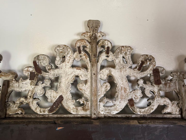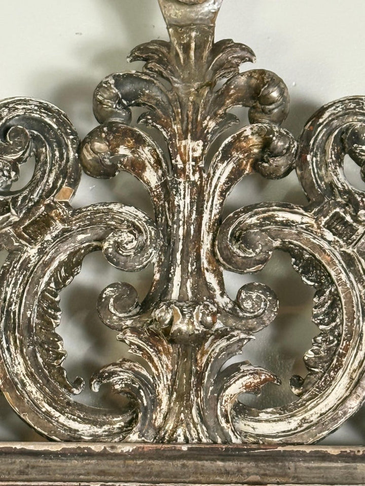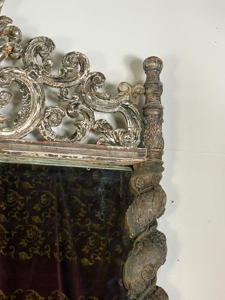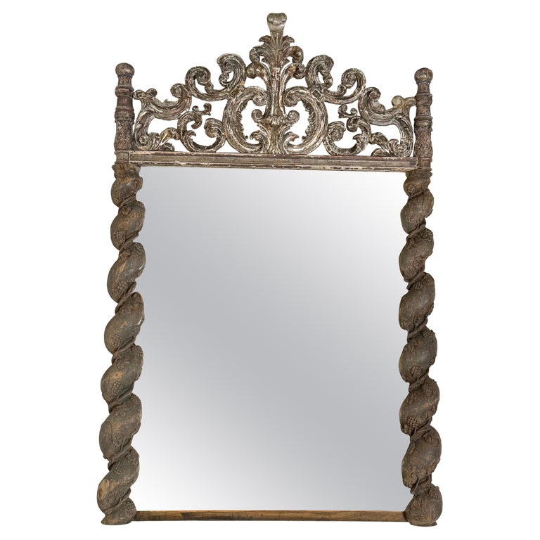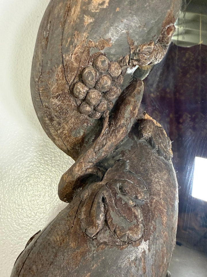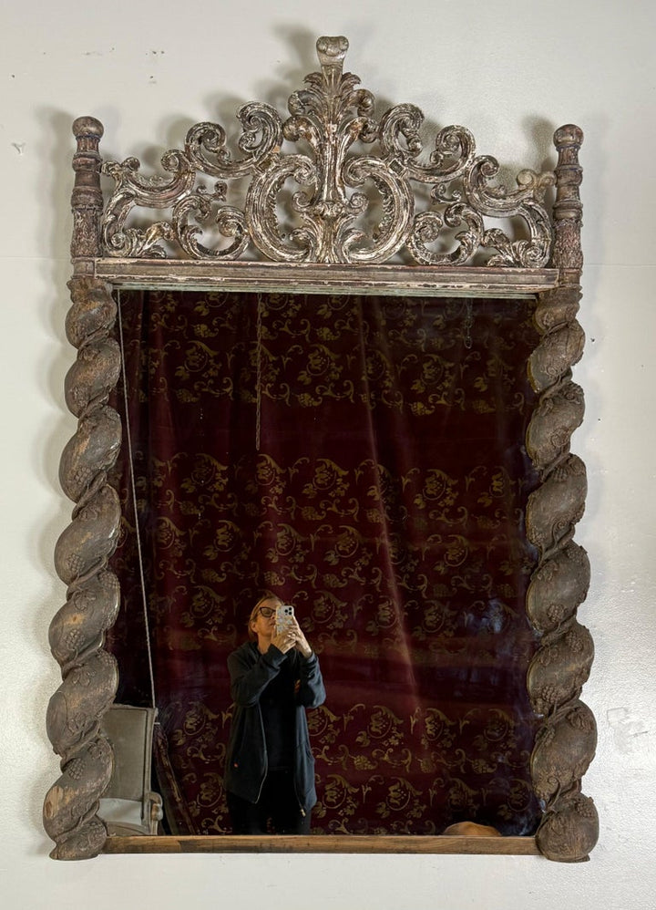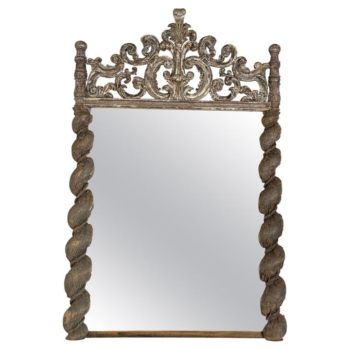 This striking mirror is a bespoke creation crafted using 19th-century elements, showcasing exceptional European craftsmanship and decorative opulence. The top features an elaborate hand-carved crest with scrolling acanthus and floral motifs, richly detailed and evocative of Baroque or Rococo influence. The sides are framed with twisted, fruit-laden vines carved in deep relief, adding a rustic and sculptural dimension to the piece. The finish retains a beautifully aged patina, with remnants of original gilding and paint highlighting its antique authenticity. This mirror serves as both a functional piece and a dramatic focal point, ideal for interiors that celebrate old-world charm and artisanal heritage.