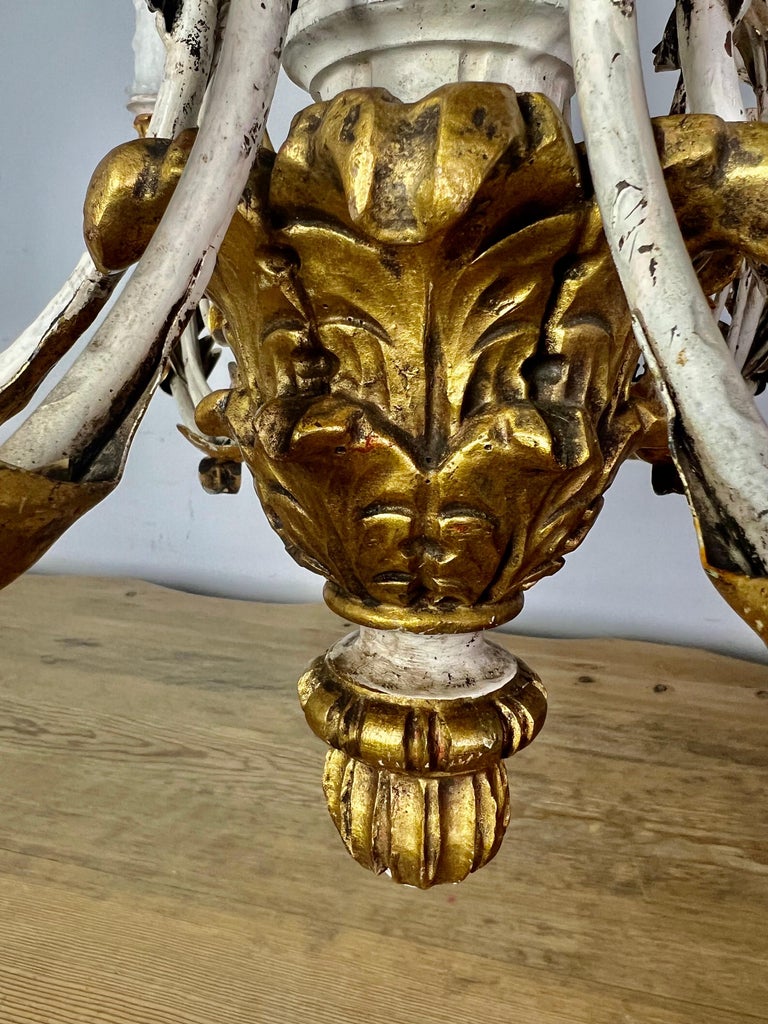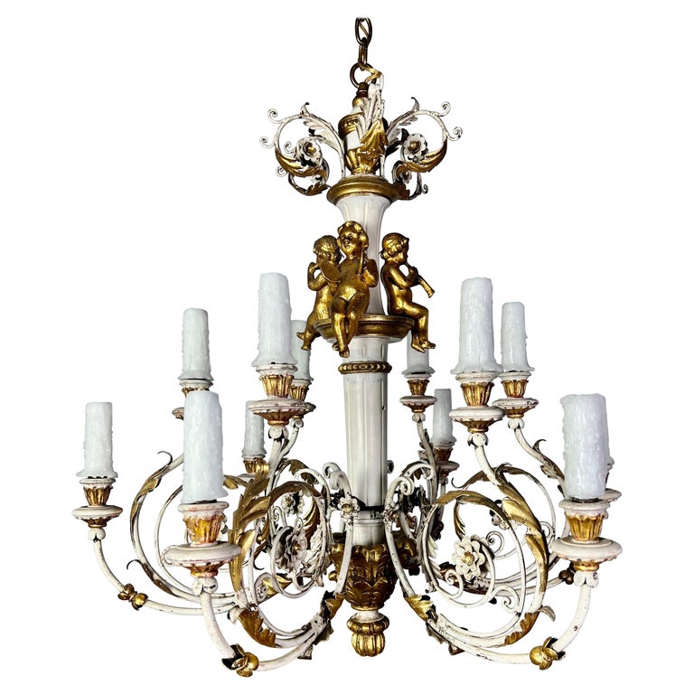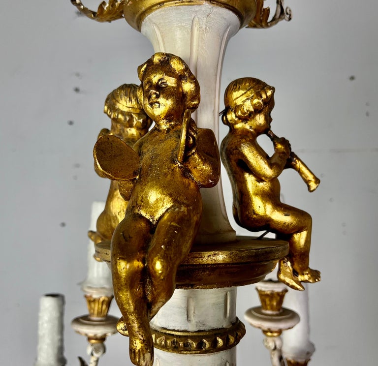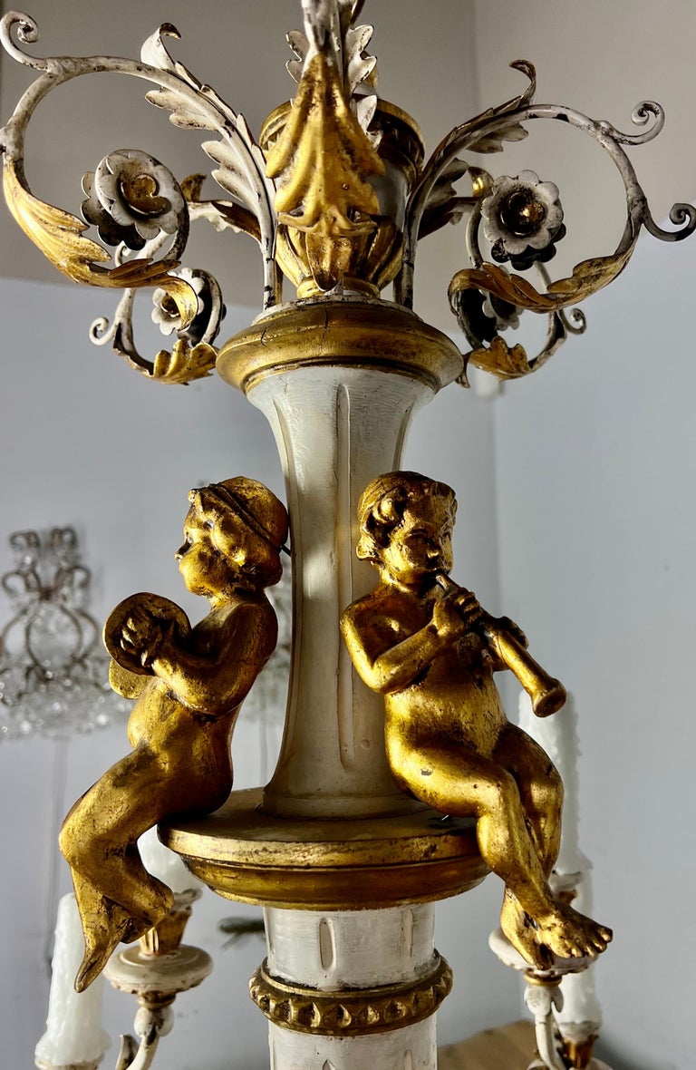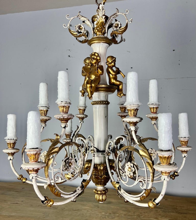 Italian twelve light painted & parcel gilt Rococo style chandelier with carved wood cherubs. The fixture is made of iron & wood and includes three giltwood cherubs playing musical instruments. The chandelier has been rewired with drip wax candles. It includes chain & canopy.