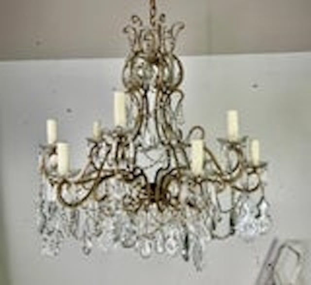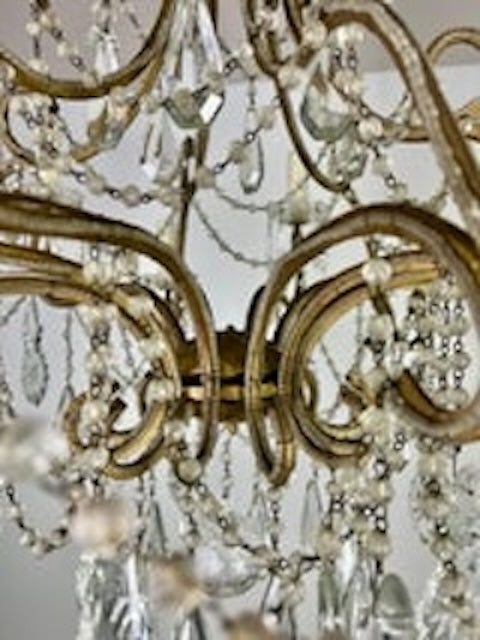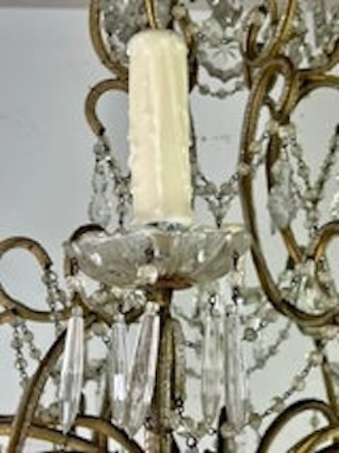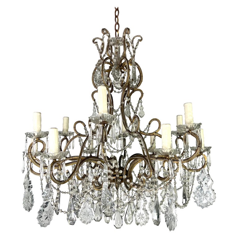 Monumental size 12-light Italian crystal beaded chandelier. This chandelier is an ornate, vintage fixture with a gold-toned metal frame featuring intricate scrollwork. It has 12-arms, each holding a drip wax candle cover with a cream colored finish. The chandelier is adorned with numerous crystal pendants of various shapes, including teardrops and faceted designs, which catch and refract light beautifully. Strands of crystal beads drape gracefully between the arms, adding to its luxurious appearance. The chandelier is suspended from a gold chain has a classic, elegant design reminiscent of traditional European styles.