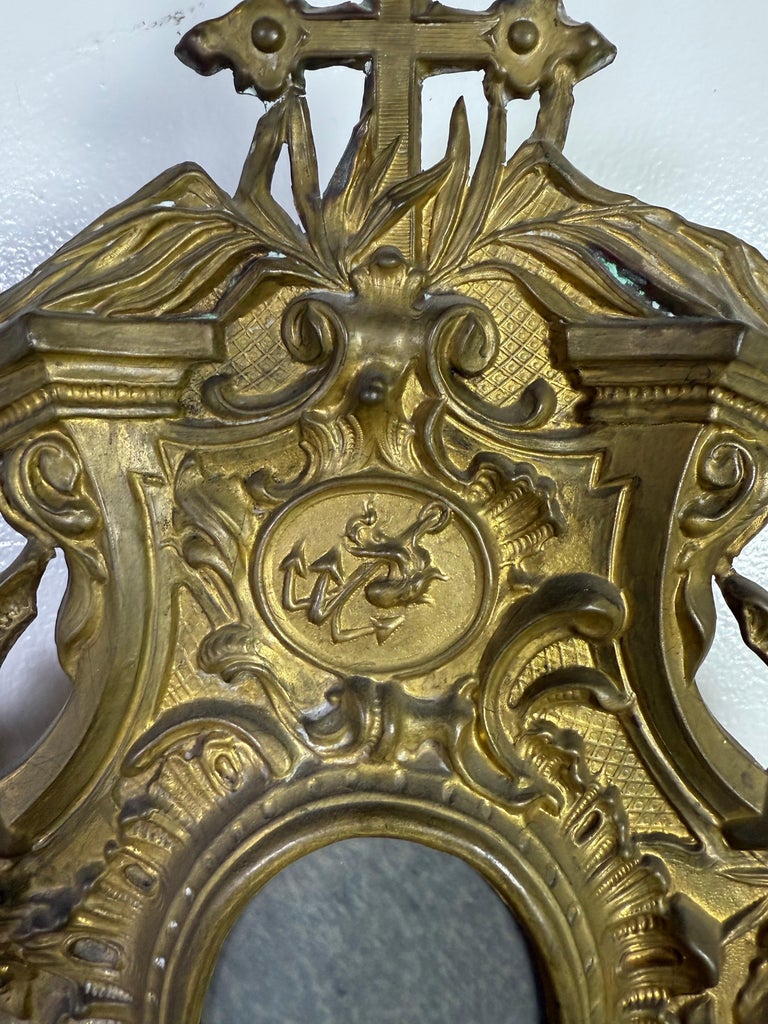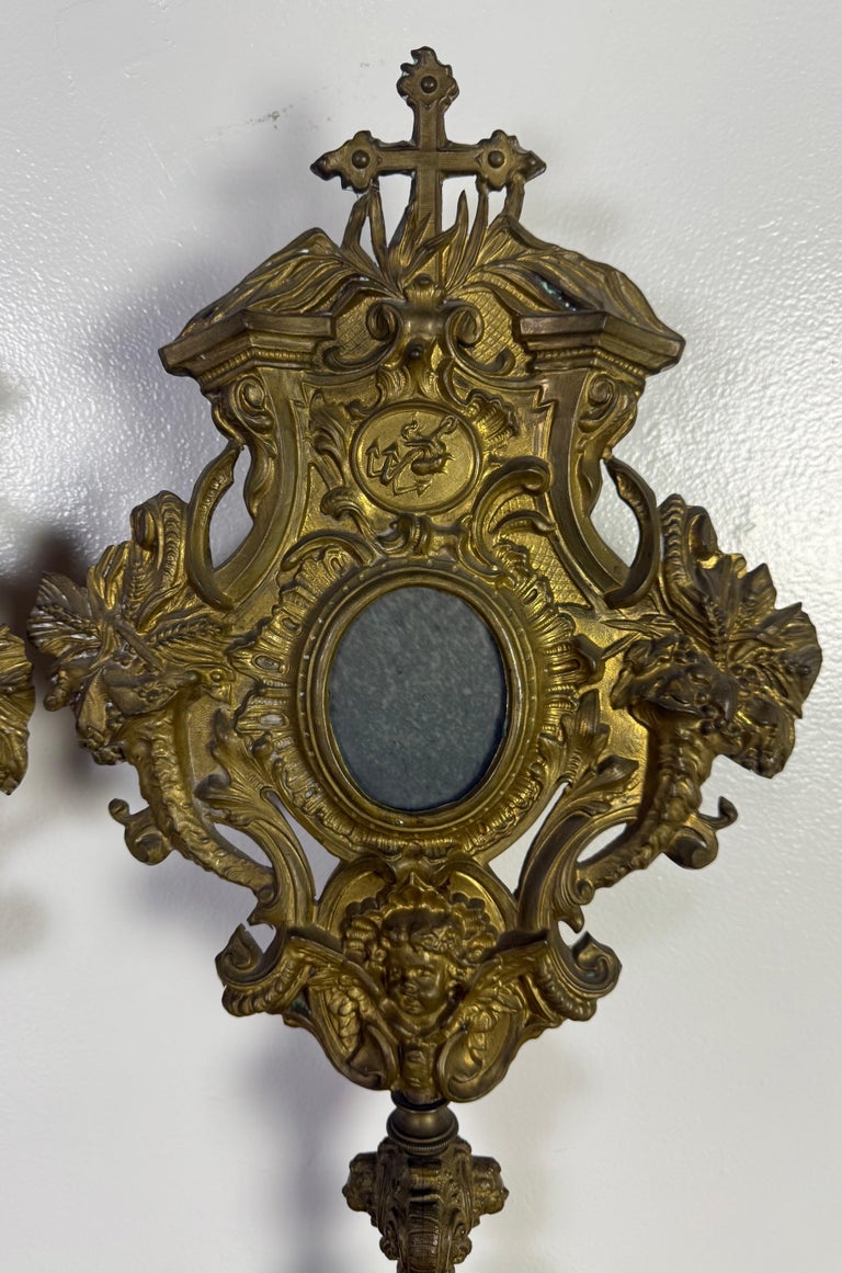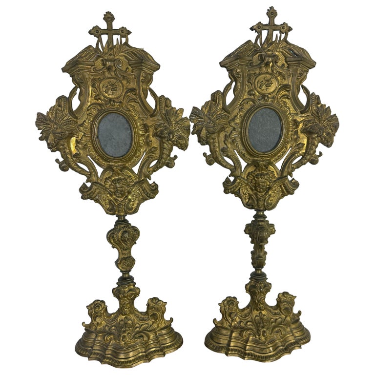 19th century pair of ornate gilded relicquaries made of brass with a gilt finish. The feature highly decorative Baroque or Rococo-style detailing, including intricate scrollwork, floral motifs, and cherub faces at the base. Each piece has an oval glass compartment at its center, which traditionally would hold a relic or sacred image. At the top of each relicquary is a small cross, reinforcing their religious significance. The symmetrical design, with elaborate flourishes and acanthus leaves extending outward, enhances their grand and ceremonial appearance. The sturdy pedestal bases are adorned with rich detailing and provide a solid foundation, making these suitable for display on an altar or sacred space. These pieces likely originate from a church or religious setting, where they would have been used for veneration, possibly housing relics of saints or other holy objects. The would be considered great examples of historical ecclesiastical art.