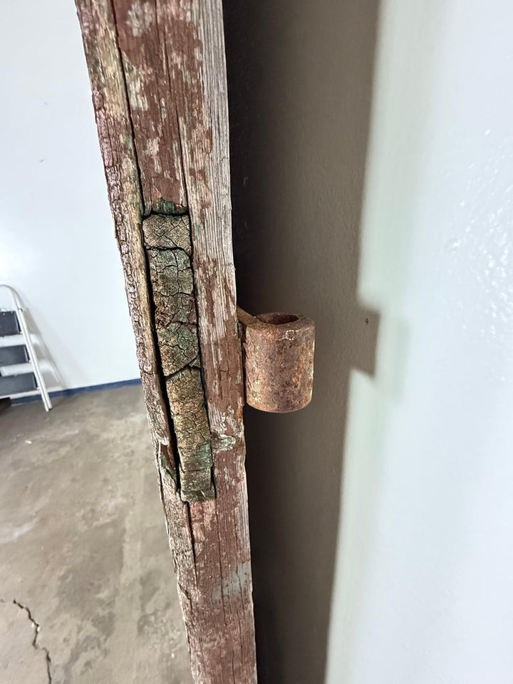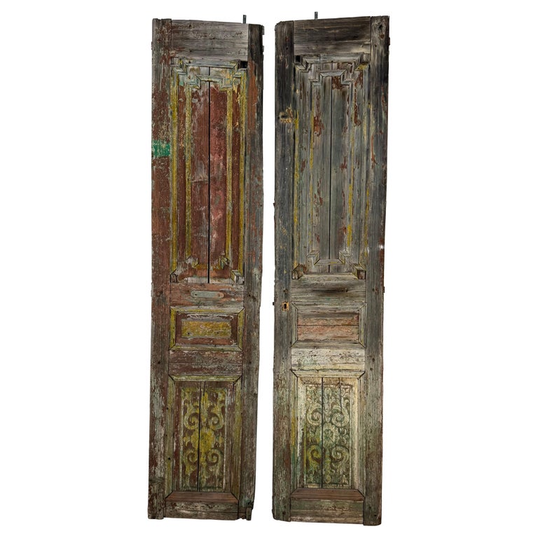 air of 19th century wooden doors with a heavily weathered and distressed appearance. They have intricate carved details, including raised panels and ornamental patterns, particularly in the lower sections where scrollwork is visible. The original paint has largely worn away, leaving a mix of faded greens, yellows, browns, and traces of other colors, adding to their rustic charm. The wood is aged with cracks, peeling paint, and signs of exposure to the elements. The doors still have part of their original hardware.