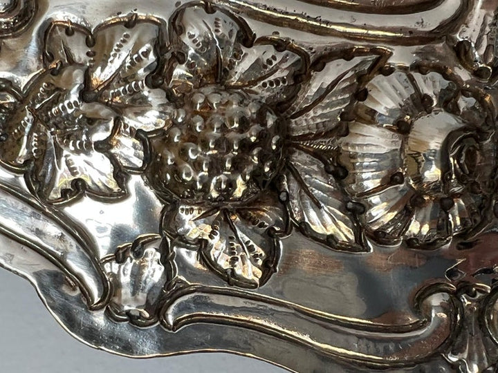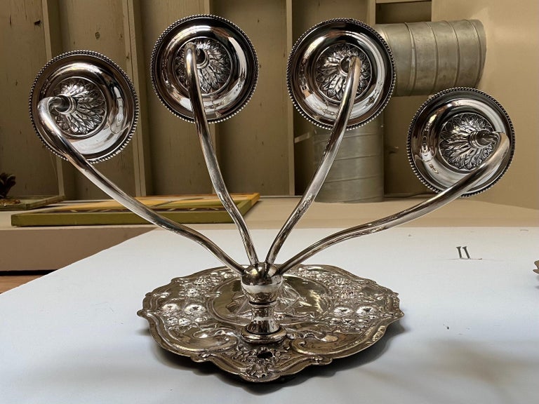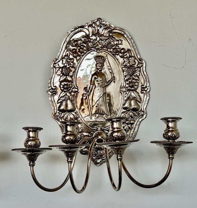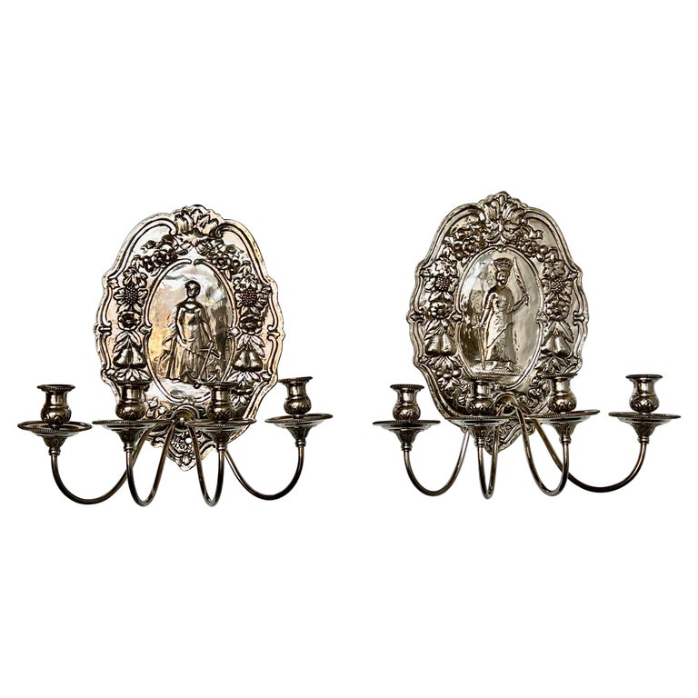 Pair of 19th C. English handmade silver plated candle sconces. The 4-light sconces are all hand hammered. They are decorated with a figure of a crowned man with swords and a detailed woman holding an anchor. The sconces are also decorated with sunflowers, pears and more. They are not wired for electricity