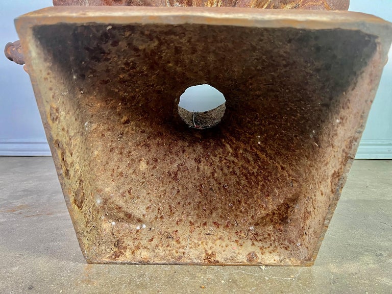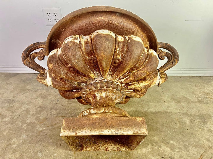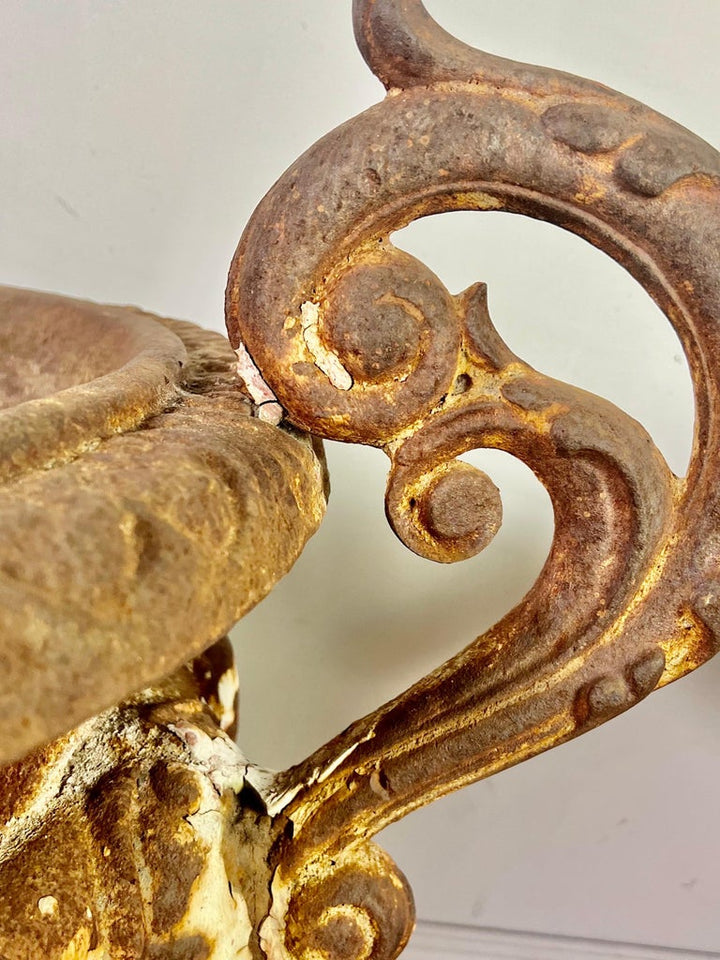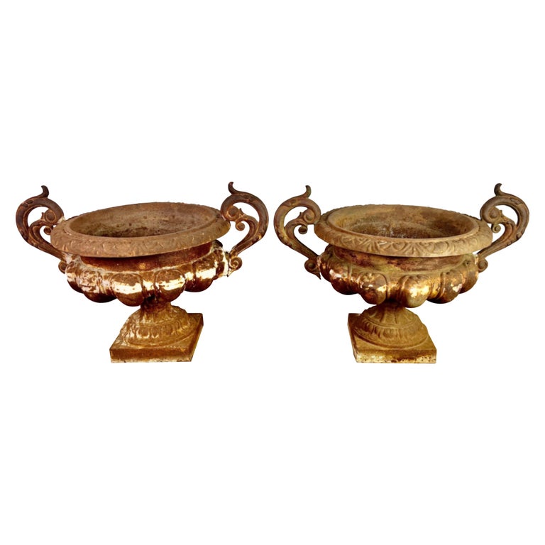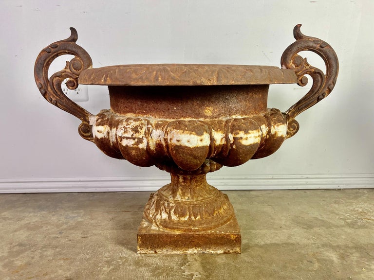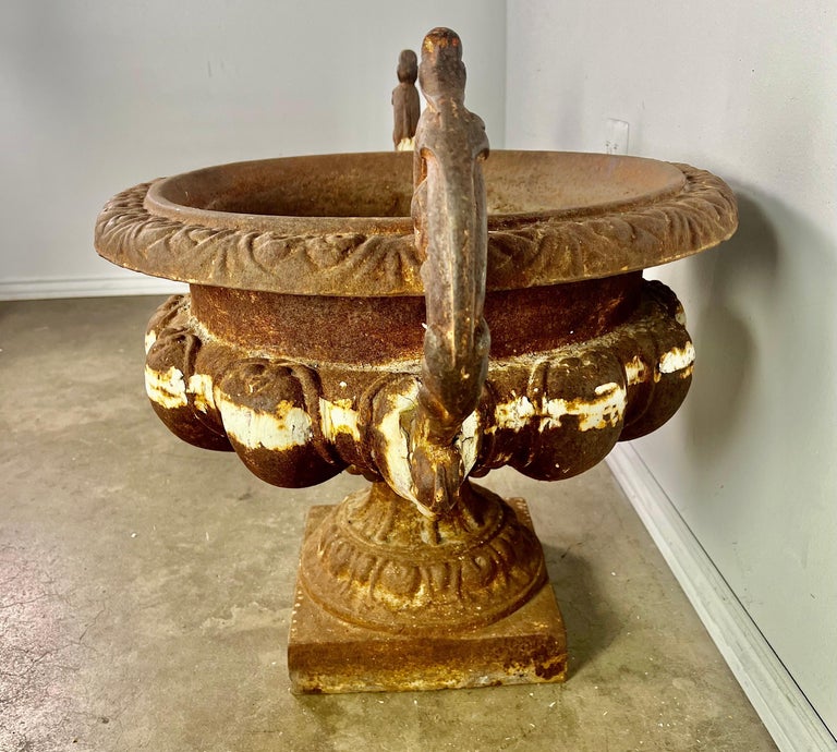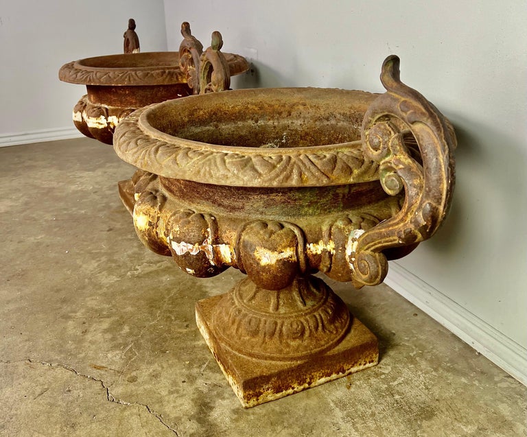 Pair of 19th century French cast iron planters with years of wear to their beautiful patina. Great overall condition with drain holes.