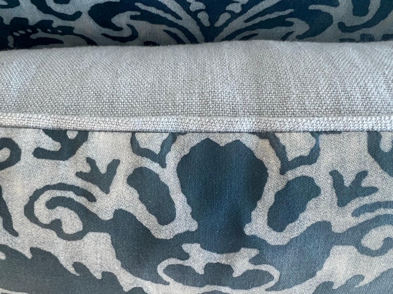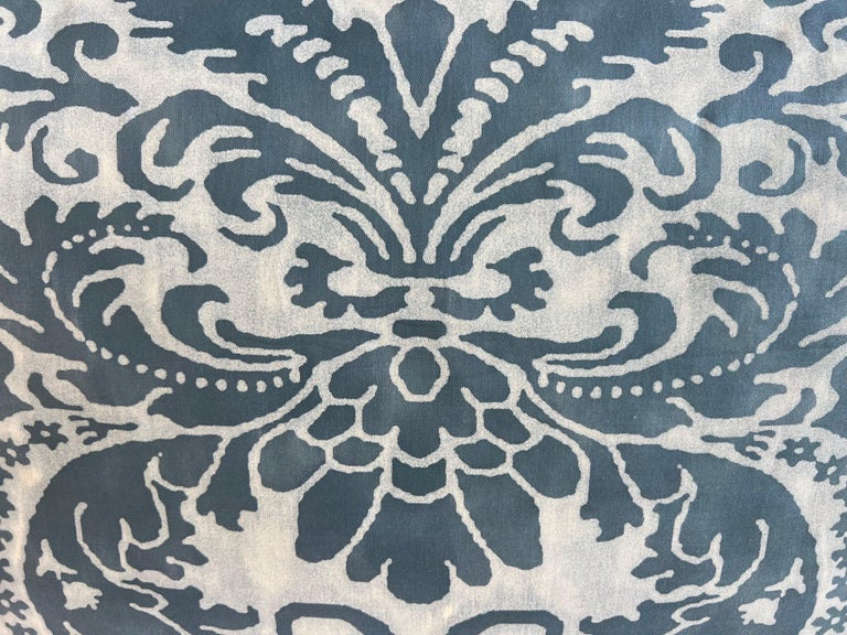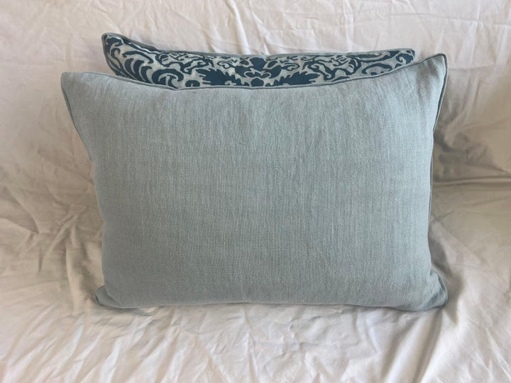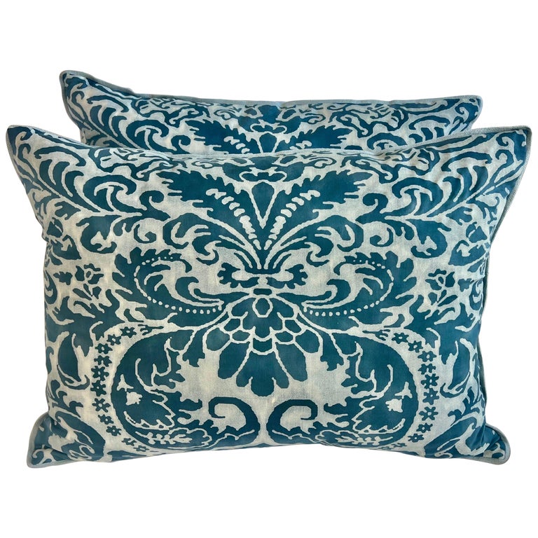 Pair of new pillows made from vintage blue Fortuny fabric fronts and soft blue linen backs to coordinate with the soft blue color in the front background. Down filled inserts, zipper closures.