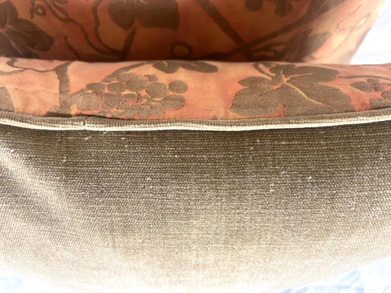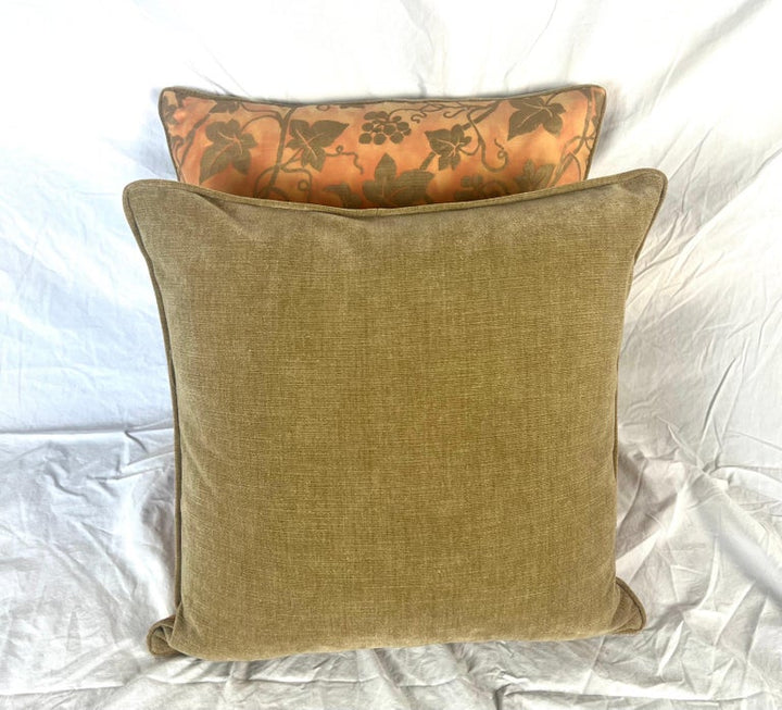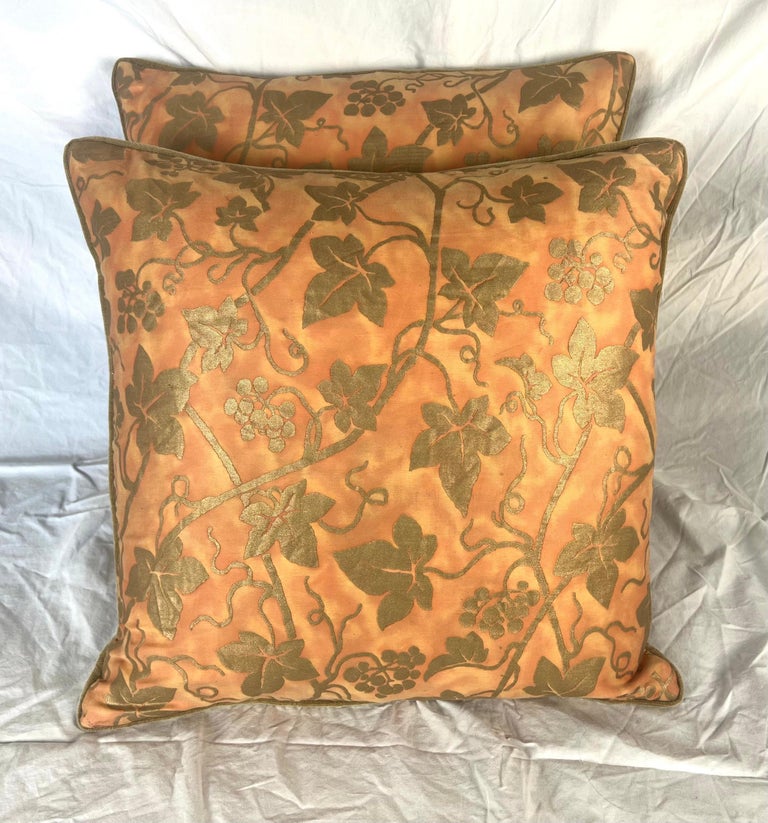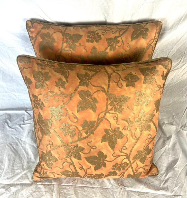 Pair of custom pillows made with Fortuny by Mariano Fortuny in the Edera pattern depicting twirling vines and grapes.  The unique colors beautiful and vibrant and would add a great accent of color in your room.  The pillows have coordinating silk backs and down inserts.