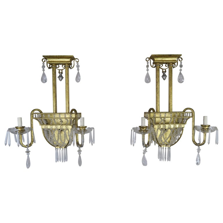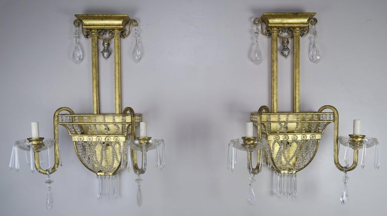 Pair of French Bronze and Rock Crystal 2-Light Sconces