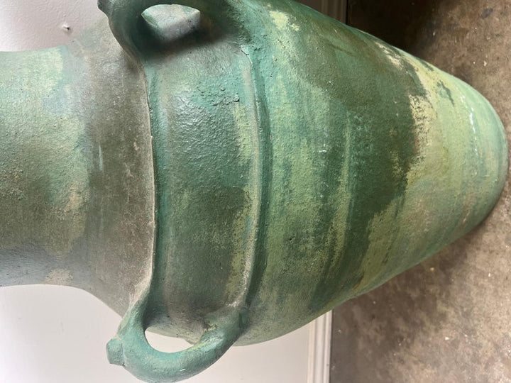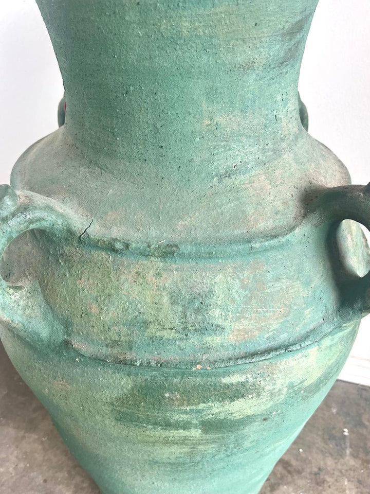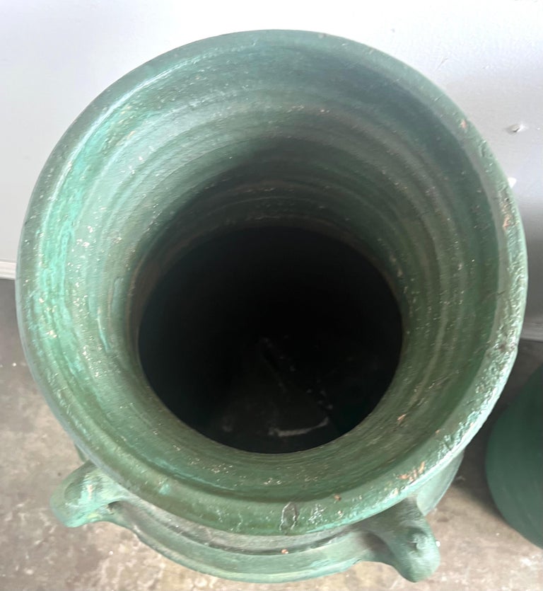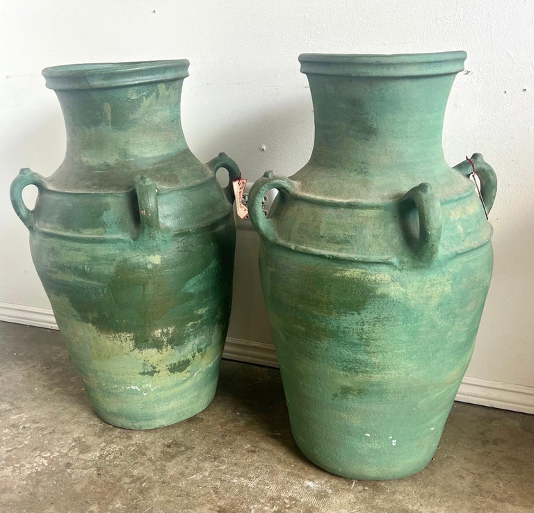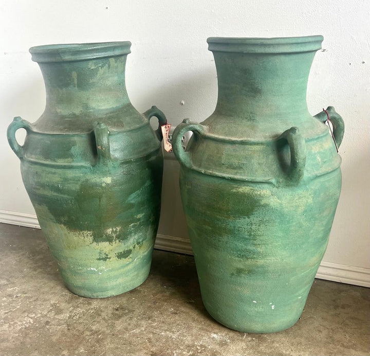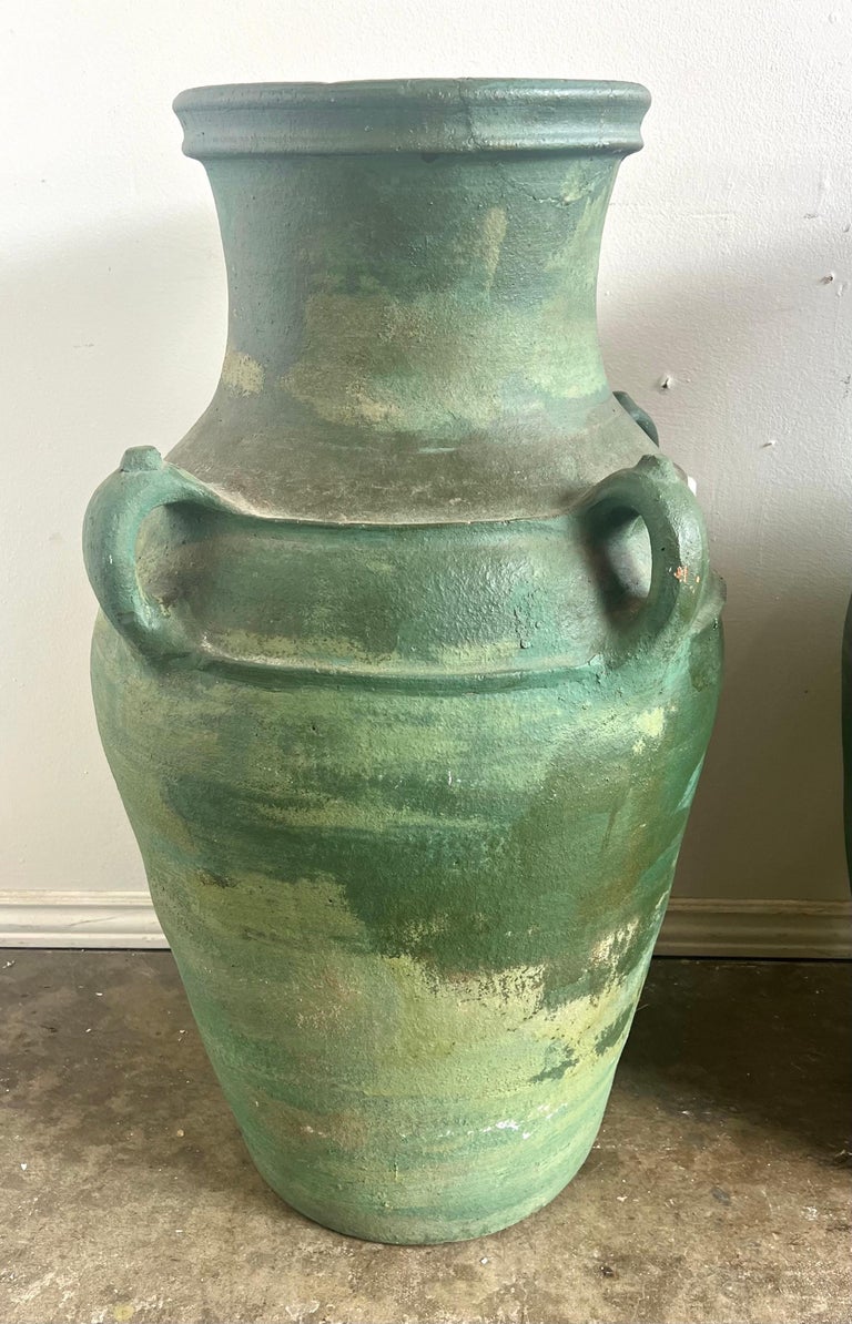 Pair of large ceramic urns, each with a robust, rounded body and a narrow, flared neck. The urns are finished in a distressed green glaze that gives them a weathered, antique appearance. Both urns are equipped with dual handles near the top. Their substantial size and the textured finish make them striking decorative pieces, likely suited for both indoor and outdoor settings.
