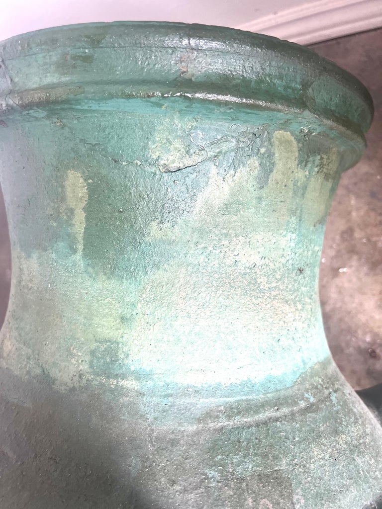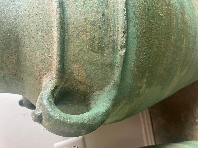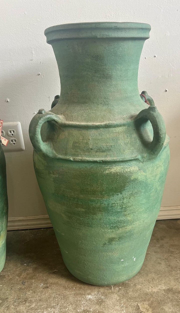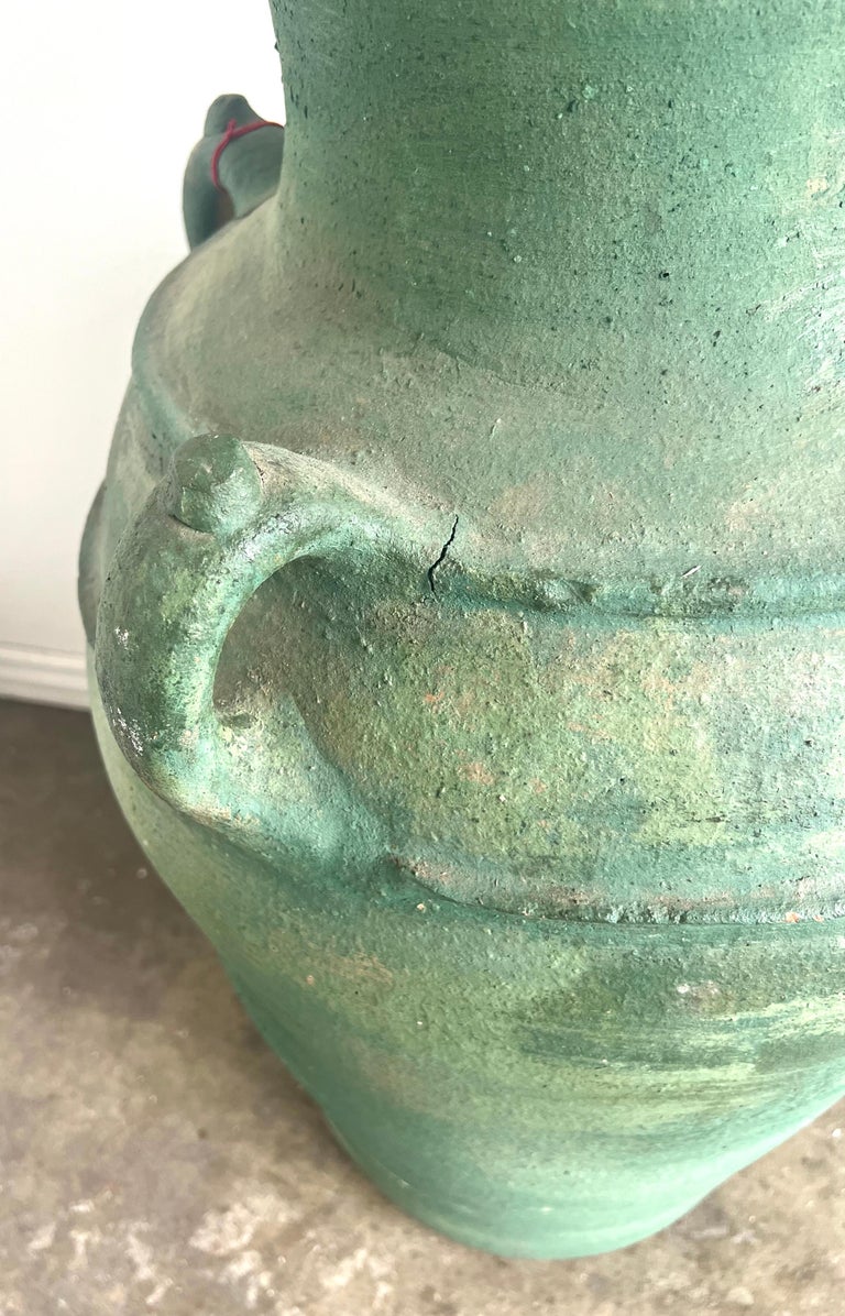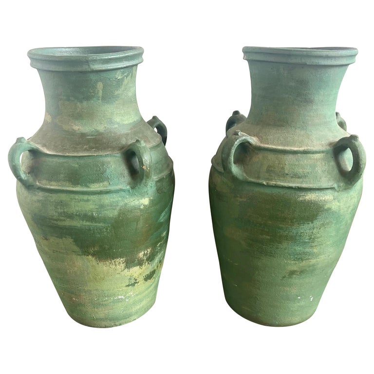 Pair of large ceramic urns, each with a robust, rounded body and a narrow, flared neck. The urns are finished in a distressed green glaze that gives them a weathered, antique appearance. Both urns are equipped with dual handles near the top. Their substantial size and the textured finish make them striking decorative pieces, likely suited for both indoor and outdoor settings.