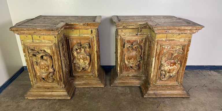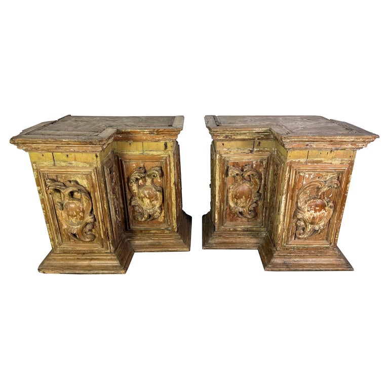 A remarkable pair of late 18th century Italian architectural elements, likely salvaged from a chapel or palazzo interior. Each piece is hand-carved from wood, showcasing deeply modeled foliate scrolls and shield motifs framed within recessed panels. The craftsmanship reflects the exuberance of the Baroque transitioning into the more restrained Neoclassical taste, with richly carved ornamentation softened by centuries of age. Traces of their original polychrome and gilding remain, worn beautifully to reveal layers of history beneath the surface. The timeworn patina, with its muted ochres, siennas, and pale gilded highlights, evokes the romantic decay of grand Italian interiors. Originally, these elements may have served as decorative bases for altars, wall niches, or architectural framing within a villa or ecclesiastical setting. Their monumental presence and raw authenticity make them ideal for reuse as console bases, pedestals, or striking decorative objects in both traditional and contemporary interiors.