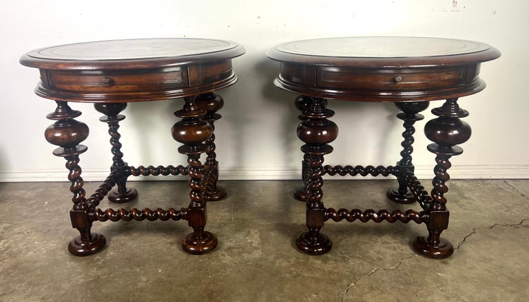 Pair of elegant round accent tables from John Richard, known for their high quality craftsmanship and luxurious designs.  The tables feature rich, dark wood with a polished finish.  The tops have a smooth, rounded edge and a subtle beveled detail for an added touch of sophistication. The tables also have leather gold embossed tops and a center drawer.