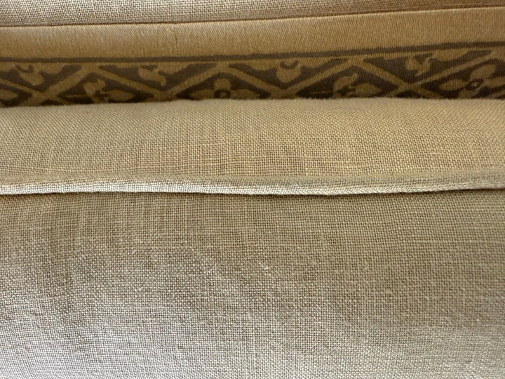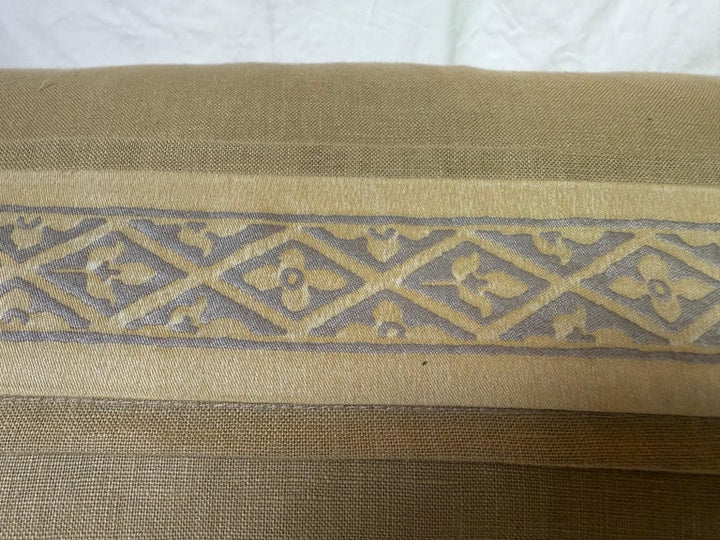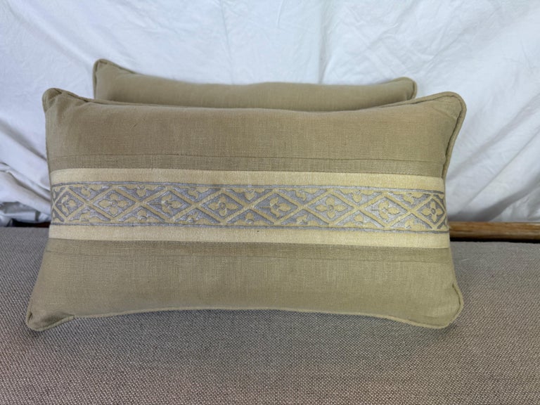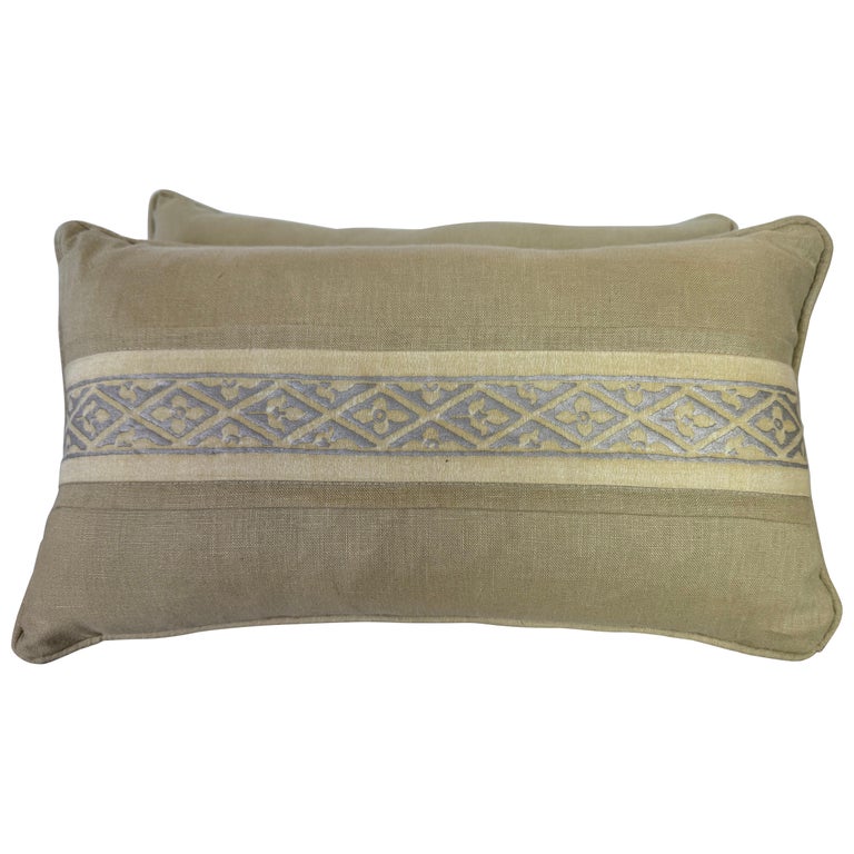 These elegant pillows feature a sophisticated blend of textures and patterns. They are crafted from high-quality linen fabric, which serves as a neutral and subtly textured background, allowing the exquisite Mariano Fortuny textile accent to stand out. The Fortuny fabric strip showcases a classic and intricate design, inspired by Renaissance motifs, with a soft gold metallic sheen that contrasts beautifully against the matte linen. The tonal balance of warm beige and muted gold with hints of silver or taupe creates a refined and timeless aesthetic. The pillows have a tailored look, with precise stitching and a structured shape, making them a versatile and luxurious addition to any space. The concealed zipper or envelope closure on the back ensures a seamless finish while maintaining the focus on the textile artistry.