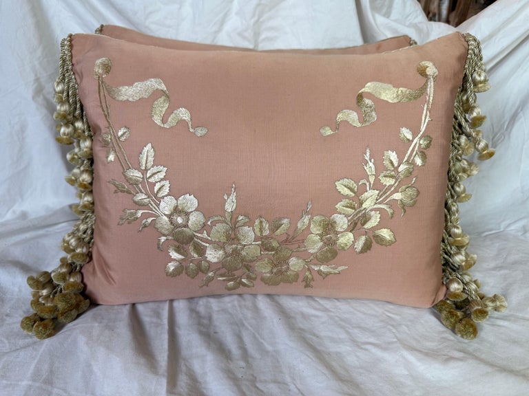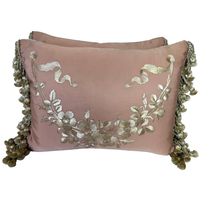 Pair of Pink Silk Embroidered Pillows w/ Tassel Fringe