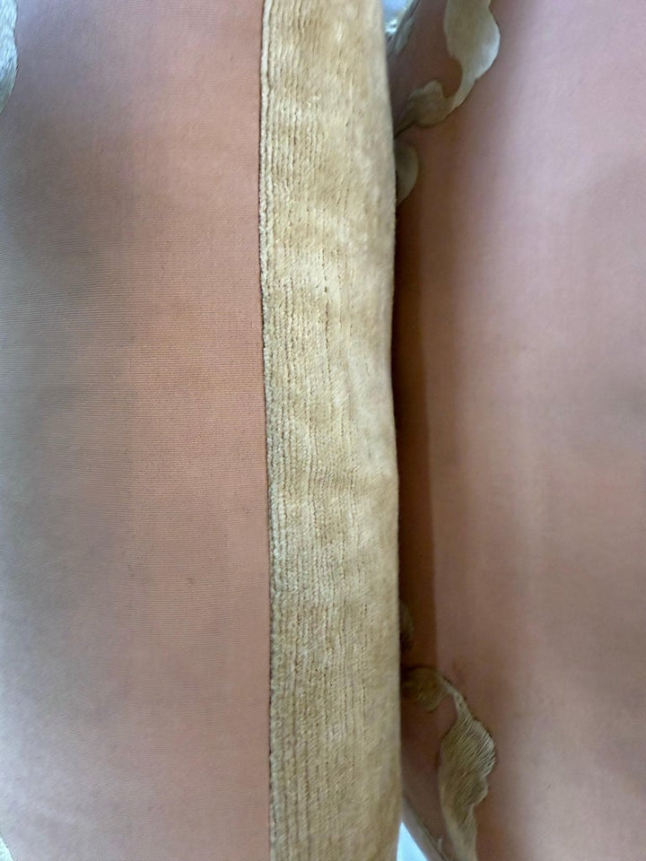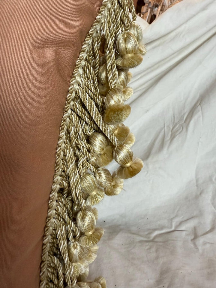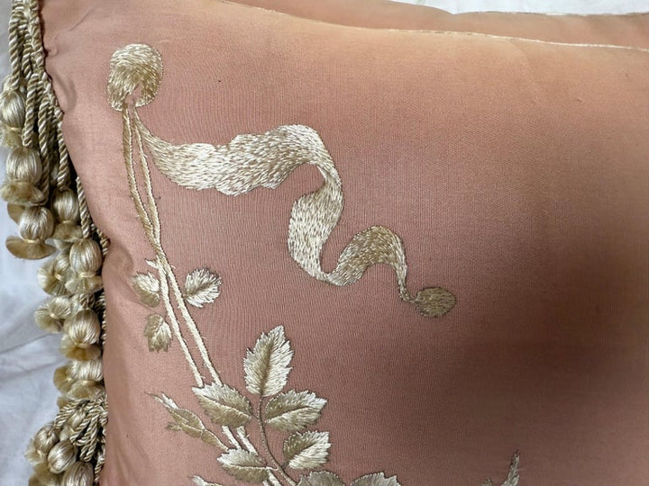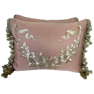 These embroidered silk pillows exude timeless elegance and sophistication. The front showcases a dusty rose silk fabric adorned with intricate cream embroidery, featuring a graceful floral garland motif with delicate leaves and blossoms. Flowing ribbon-like accents further enhance the design, lending a regal and vintage-inspired charm. The edges are finished with luxurious cream and gold tassel trim, adding texture and refinement. The back of the pillow is made from a soft, plush cream velvet, offering a contrast in both texture and tone. These pillows would be a stunning addition to a classic, French-inspired, or antique-style décor, bringing an air of opulence and charm to any space.