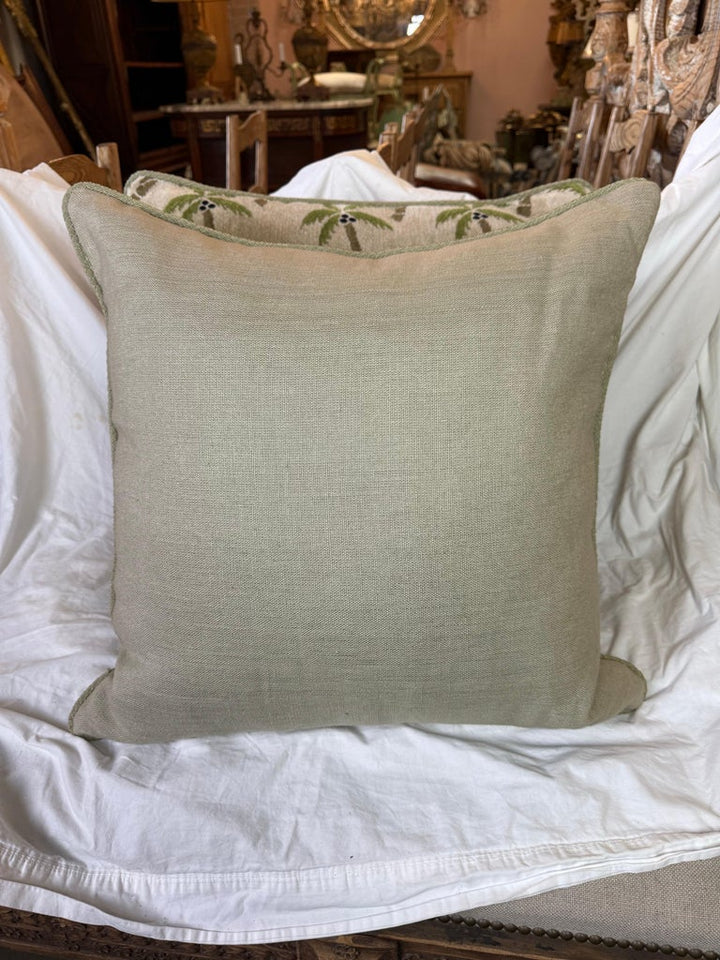 These decorative pillows feature Schumacher’s “Coconut Grove” fabric, a richly textured jacquard that brings a relaxed, tropical elegance to any space. The design showcases a repeating pattern of stylized palm trees with olive green fronds and brown, textured trunks, each accented with small clusters of coconuts, all set against a warm, sandy beige background. Made from a blend of viscose, linen, and cotton, the fabric has a soft yet durable hand, offering both comfort and sophistication. There is a neutral Belgium linen back and a contrasting cord detail with a hint of green. Down filled inserts. The subtle dimensionality of the weave enhances the pattern’s organic feel, making these pillows a perfect choice for coastal, island-inspired, or casual-chic interiors.