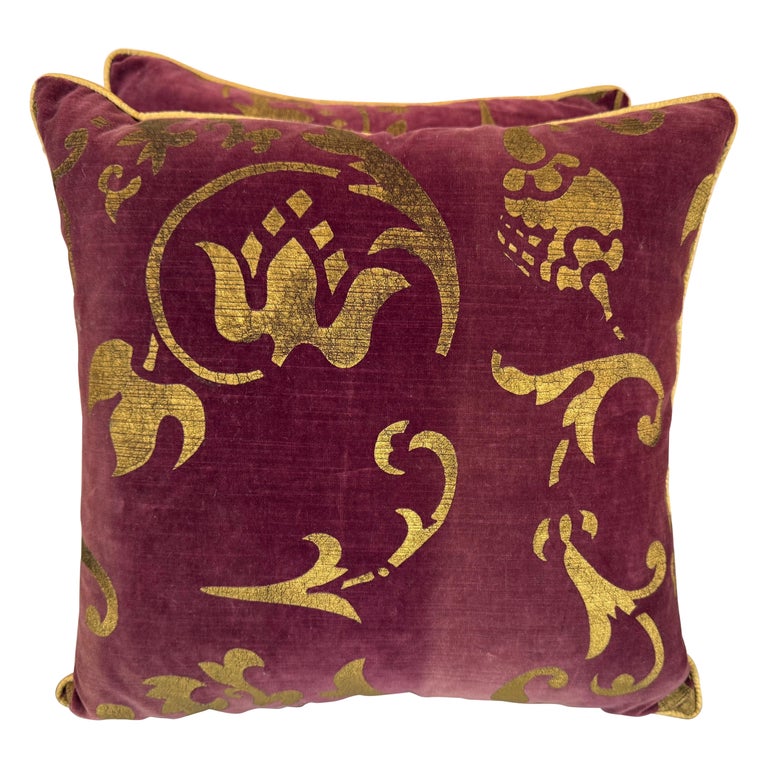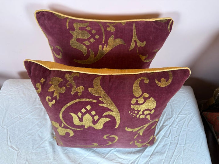 This elegant pair of pillows is crafted from luxurious stenciled velvet by Nomi Textiles, a studio known for its richly patterned and artisanal fabrics. The base fabric is a deep, dusty rose or plum-toned velvet that exudes warmth and sophistication. Overlaying the velvet is an intricate gold metallic stencil design, featuring stylized botanical and scrolling motifs with a hint of Ottoman or Moorish influence, giving the pillows a regal and exotic aesthetic. Down inserts.