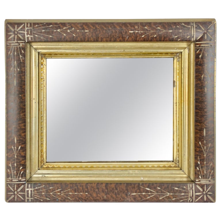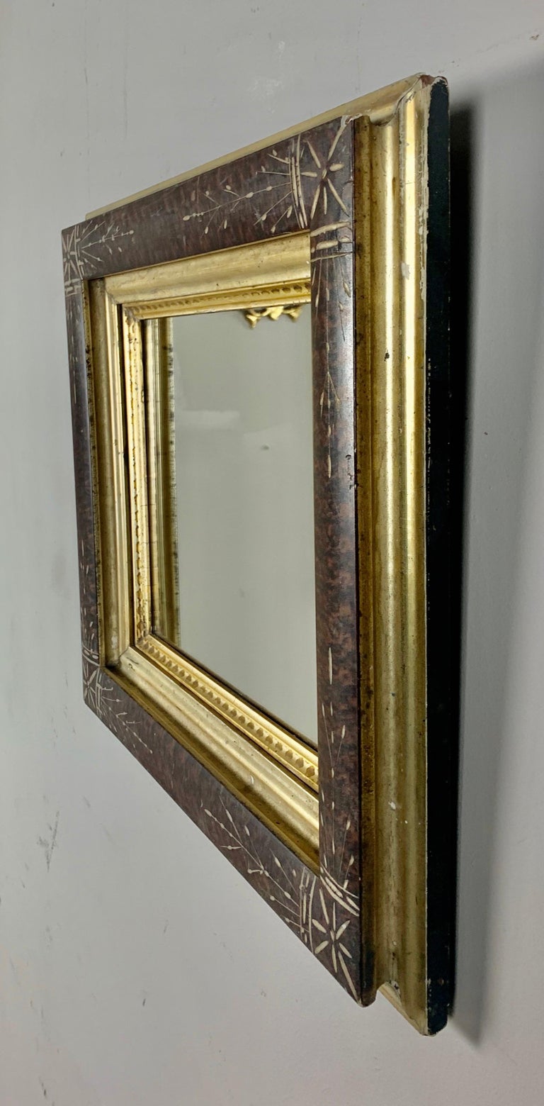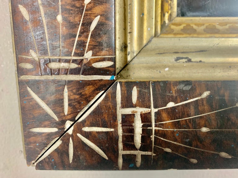 19th century English wood frame with mirror inset. The mirror is decorated with beautiful inlay designs throughout. Giltwood liner with stenciled detailing.