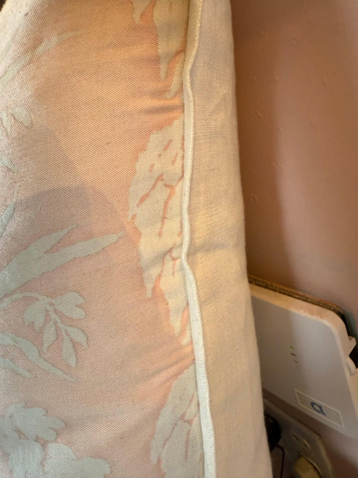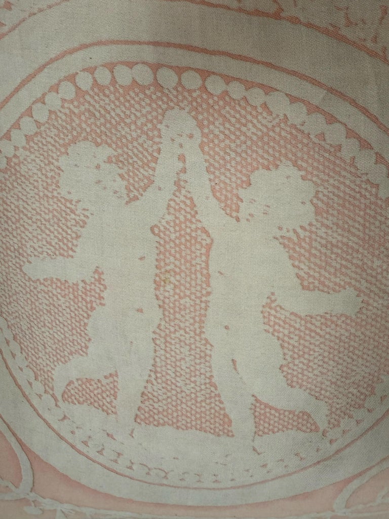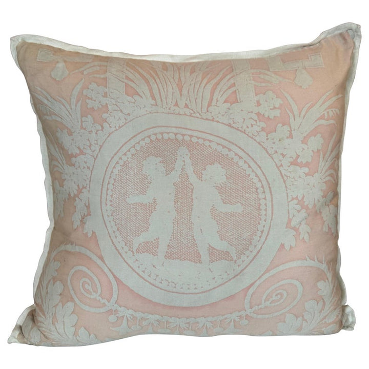 This elegant pillow showcases exquisite Fortuny textile craftsmanship. The front features a soft blush-toned background overlaid with a pale, intricate design depicting two classical figures in a medallion surrounded by lush botanical motifs and stylized scrollwork. The delicate, almost ethereal quality of the fabric evokes a sense of timeless European sophistication. The pillow is backed with white linen, adding a clean, natural contrast that highlights the ornate front pattern. Finished with simple, graceful self-piping, this pillow bring refined charm and a sense of heritage to any interior setting.