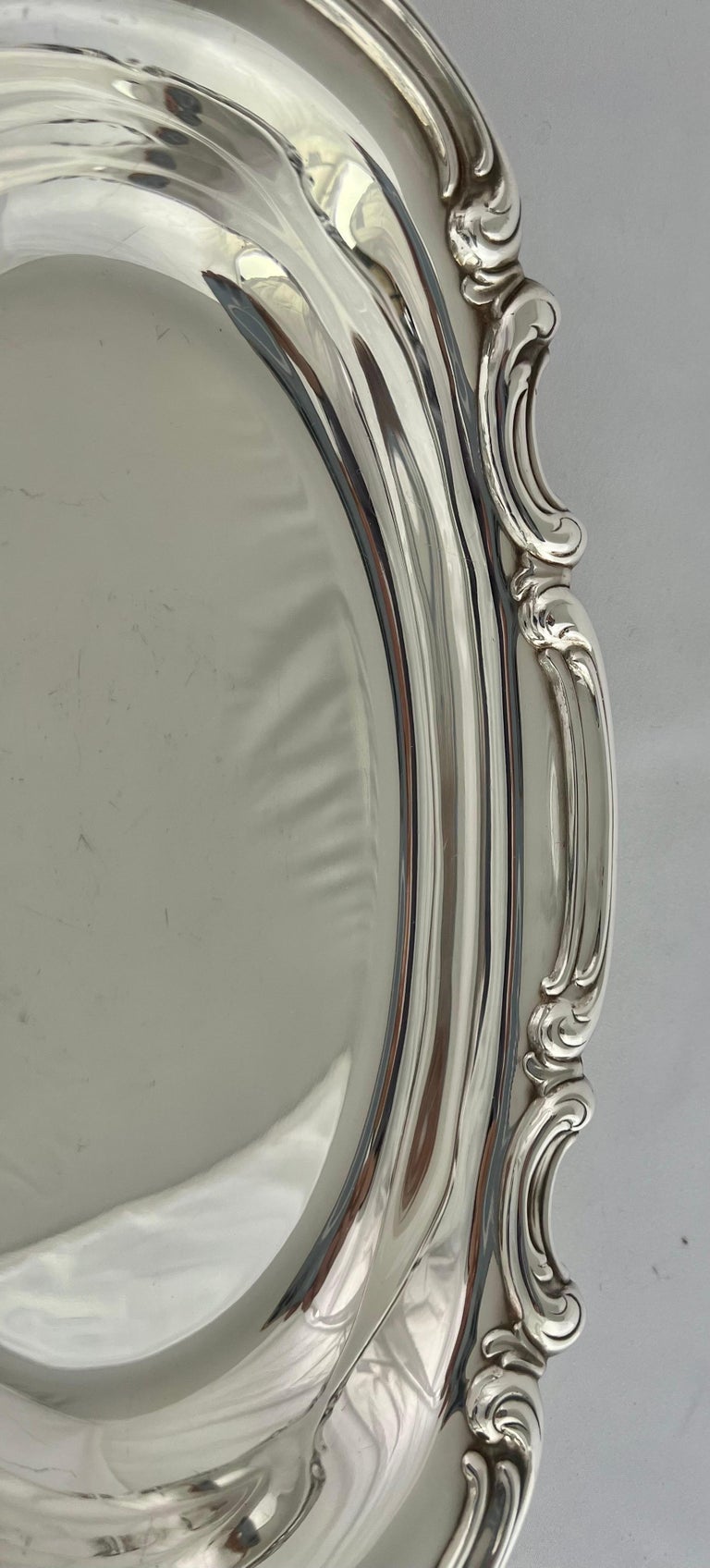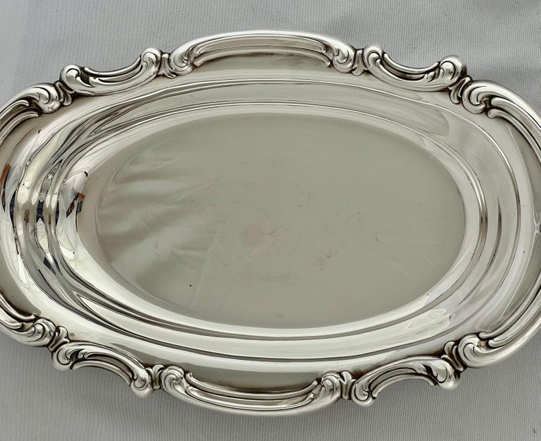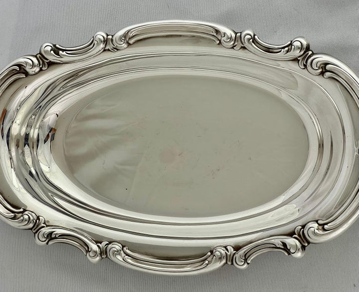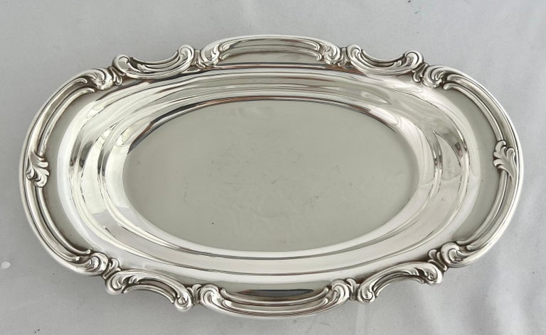 American Gorham silver plated serving dish with scrolled detail around the edge of the piece. It would be great to serve food but you can also use it for hand towels in you powder room. The dish is hallmarked Gorham with an anchor.