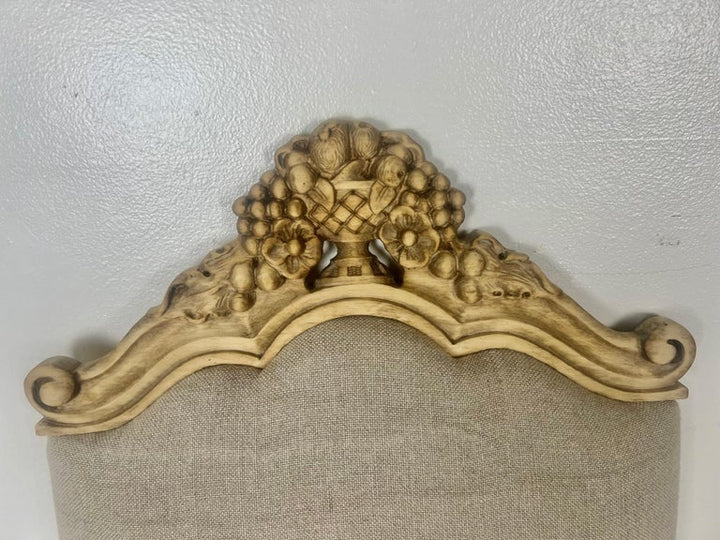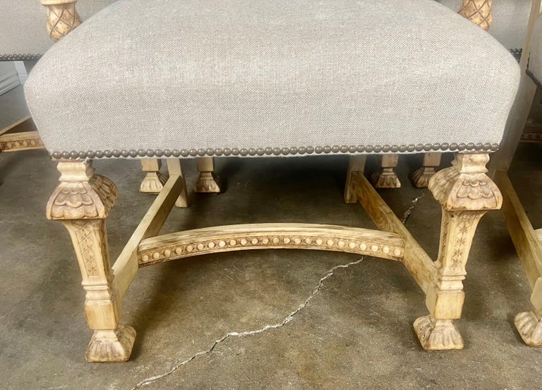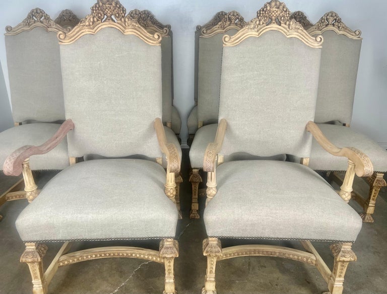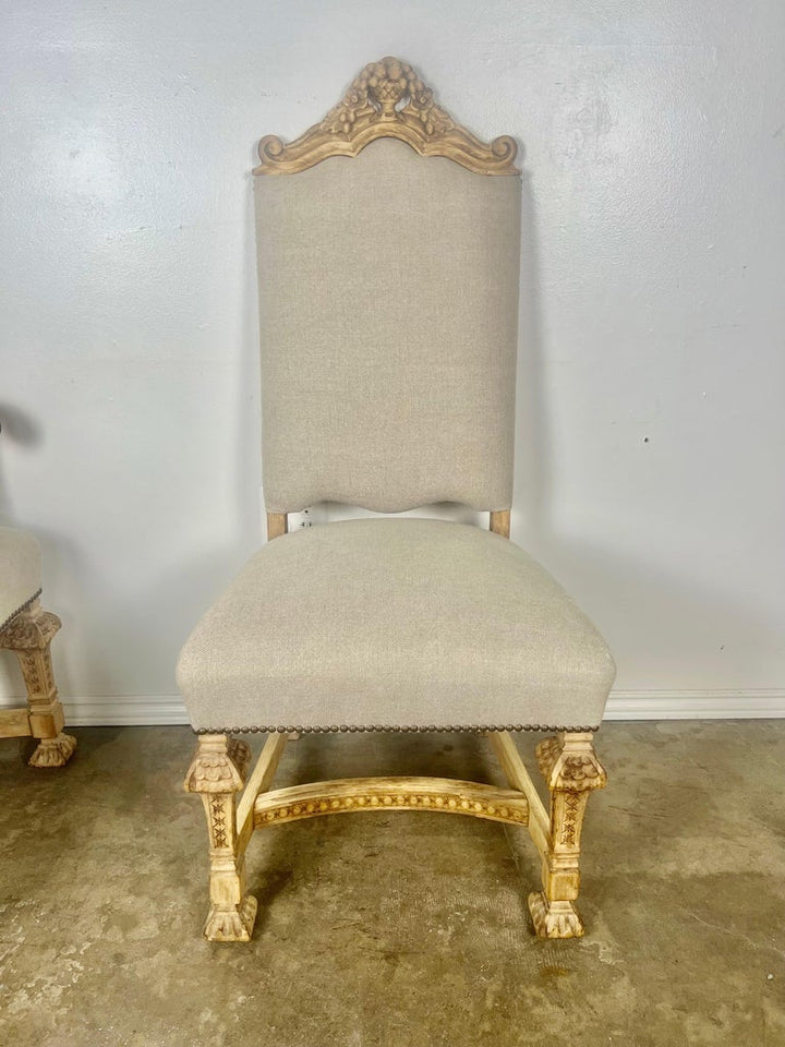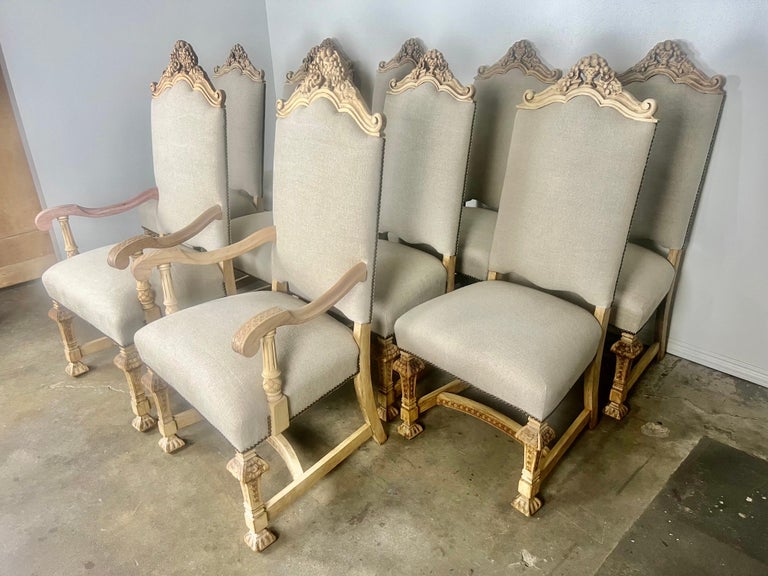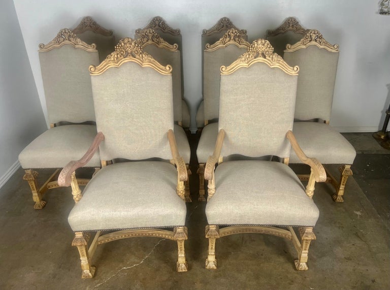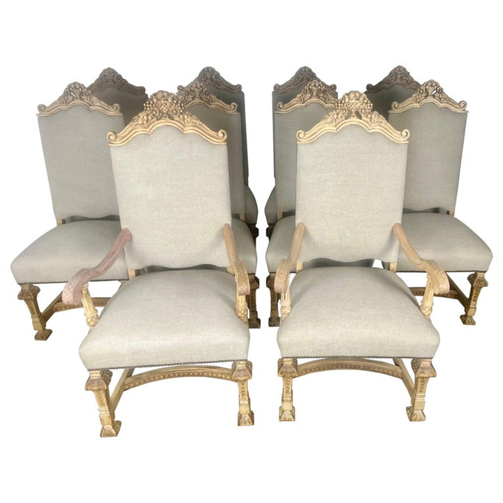 Set of Ten Italian Rococo style dining chairs with hand carved floral urn at tops of chairs. The urns are flanked by two scrolls. The chairs stand on four straight legs with intricate detailing throughout. Newly reupholstered in a washed Belgium linen with nailhead trim detail.