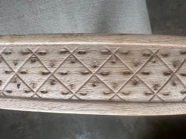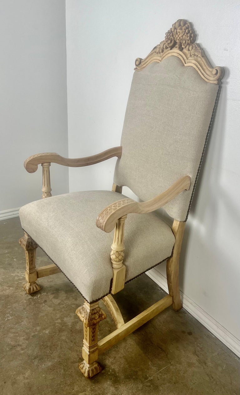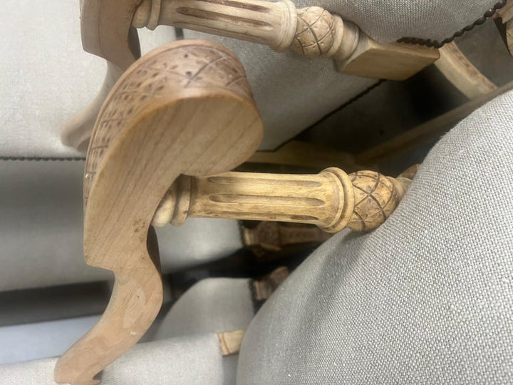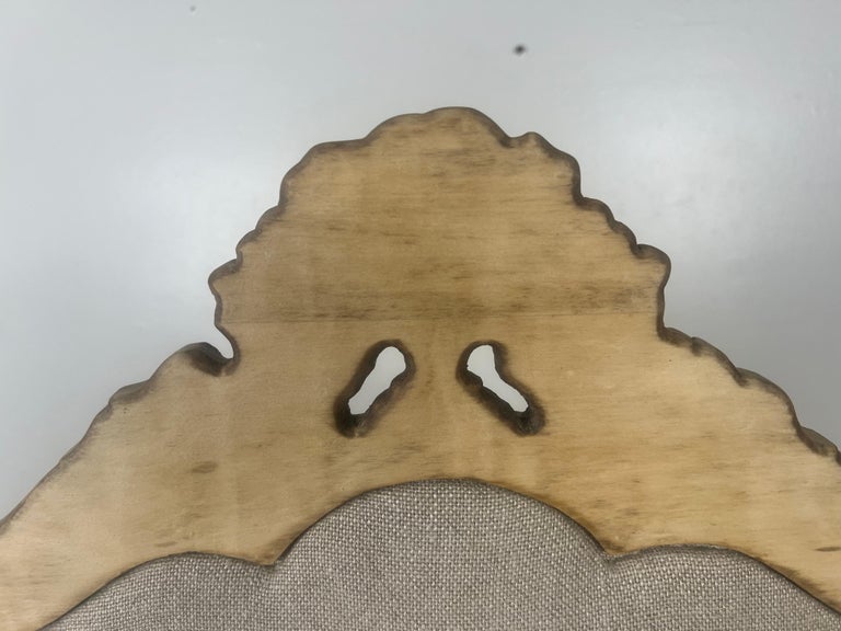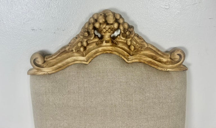 Refinished. Reupholstered. Wear consistent with age and use. Newly reupholstered in a washed Belgium linen textile with nailhead trim detail.