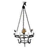 This is a rustic wrought iron chandelier with a medieval-inspired desgin. It features a circular frame supported by four chais that converge at the top for hanging. The chandelier has six candle-style ligt fixtures with white, wax-drip detailing that mimics the appearance of real candles. Gold leaf oak leaf accents are positioned around the frame, adding a touch of naturalistic elegance to the fixture. This chandelier would be ideal for a space with vintage or rustic decor.