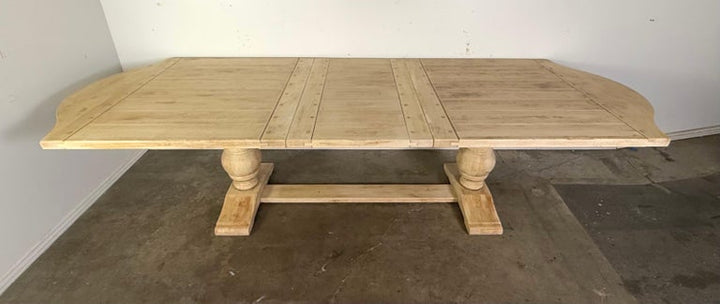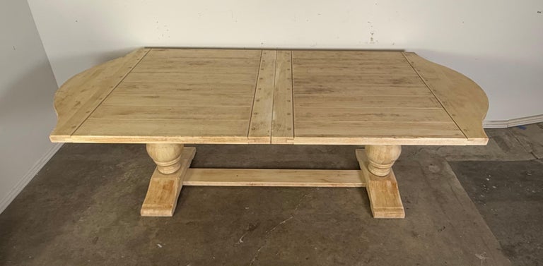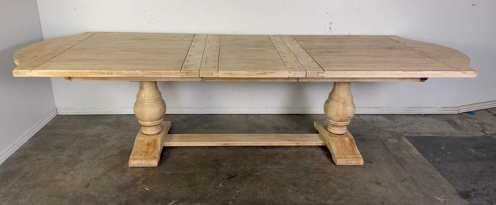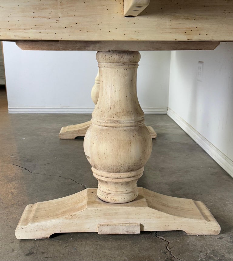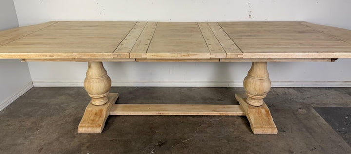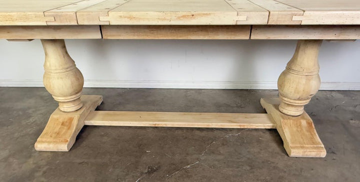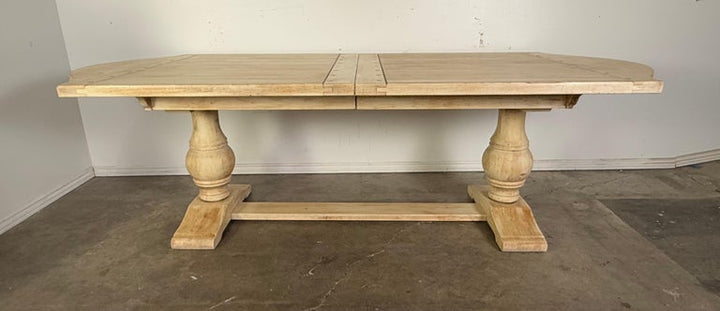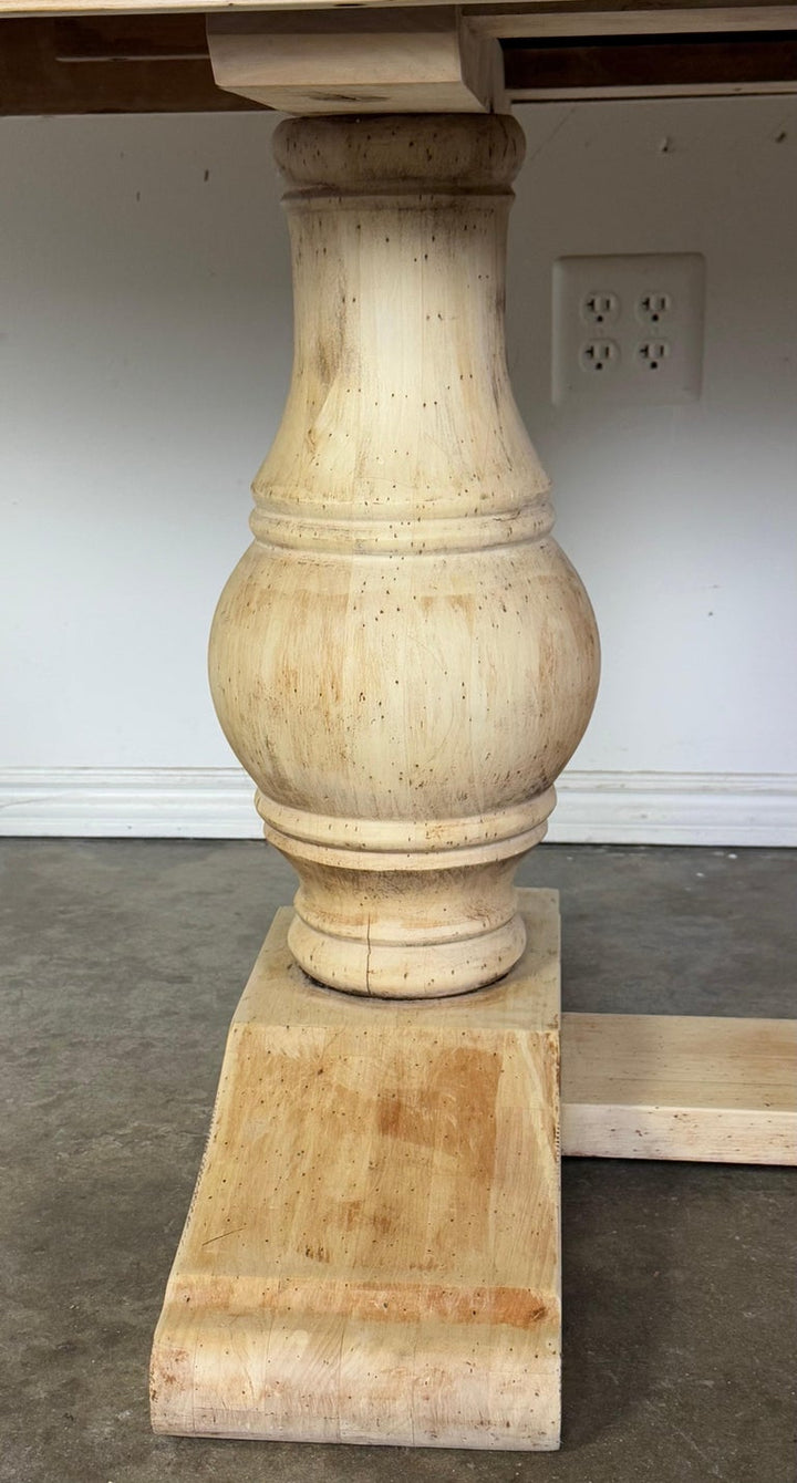 1930's Spanish rustic farmhouse style dining table with a distressed, light wood finish. It features a trestle base with two large, turned pedestal legs that provide a classic, traditional look. The table has a leaf extension that measures 24" X 44.5". The size of the dining table without the leaf is 96"L X 44.5"W. The visible wood grain, natural imperfections, and slightly weathered finish contribute to its overall appeal. This table is well suited for farmhouse, rustic, or traditional interior settings.
