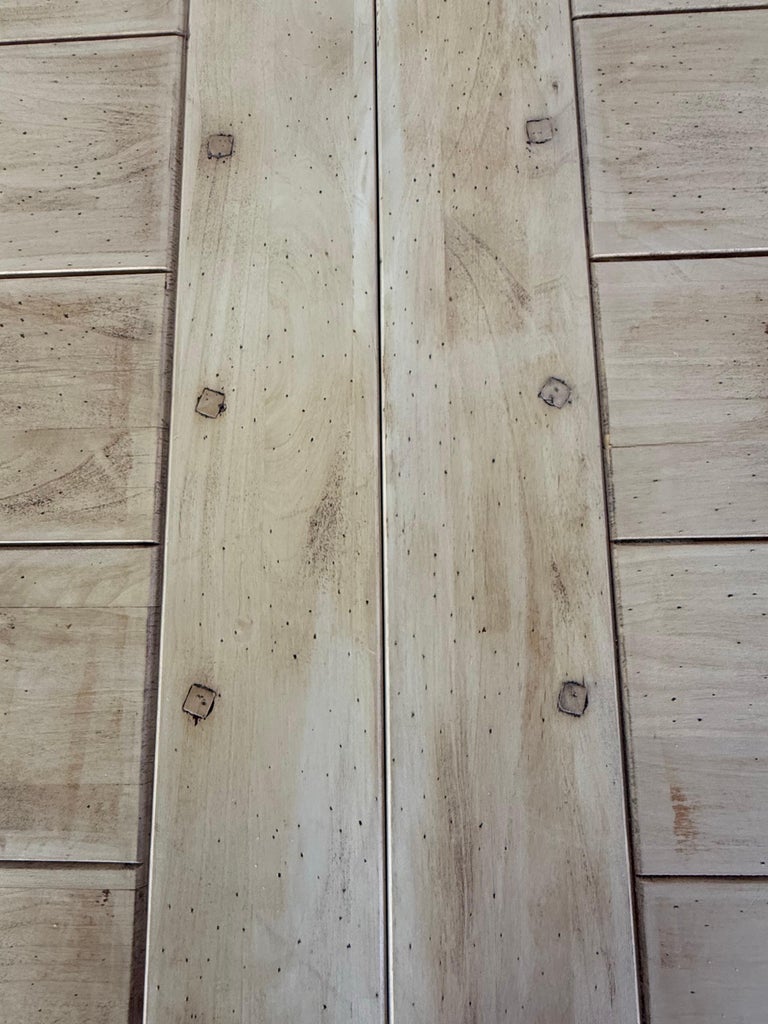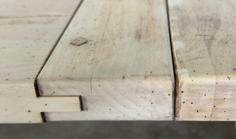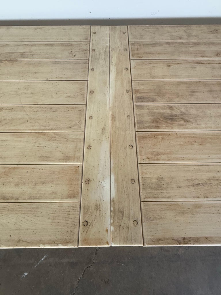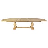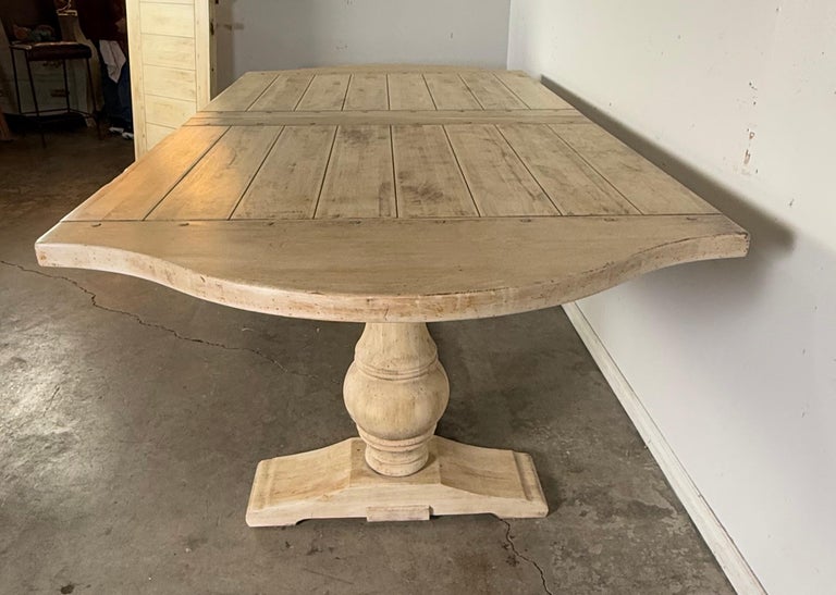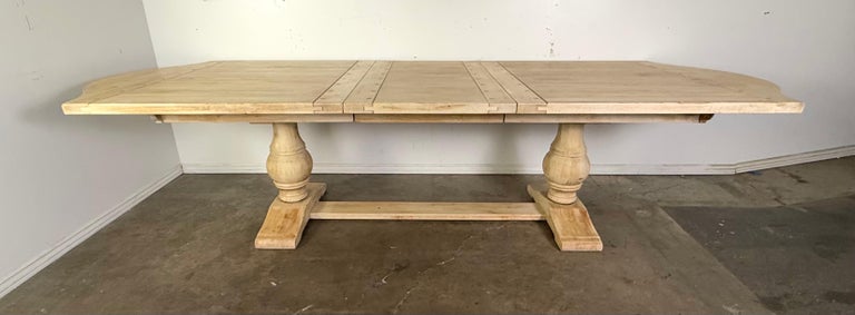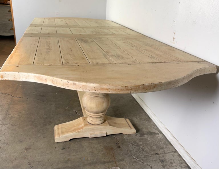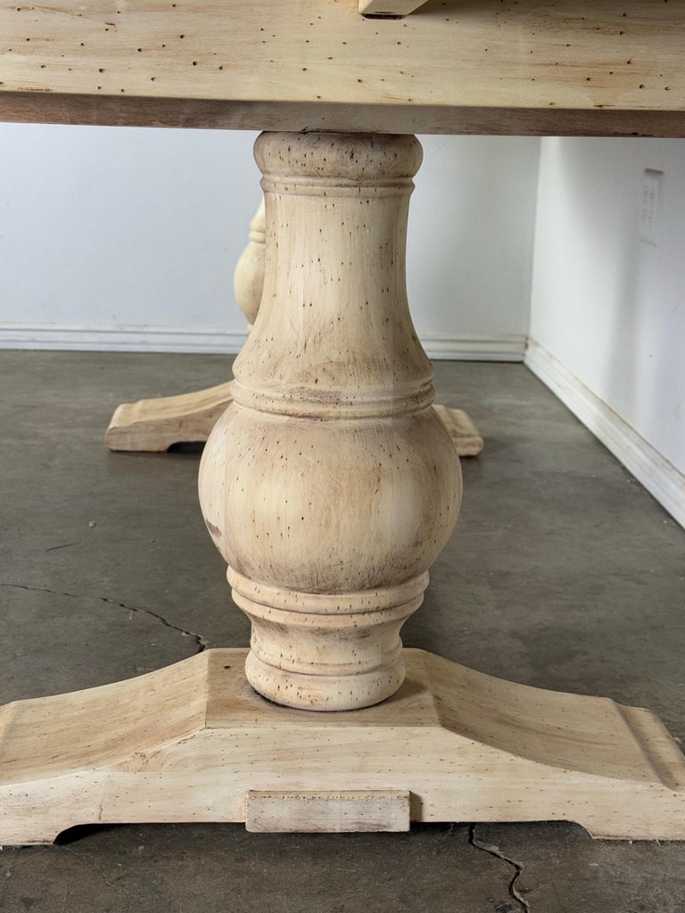 1930's Spanish rustic farmhouse style dining table with a distressed, light wood finish. It features a trestle base with two large, turned pedestal legs that provide a classic, traditional look. The table has a leaf extension that measures 24" X 44.5". The size of the dining table without the leaf is 96"L X 44.5"W. The visible wood grain, natural imperfections, and slightly weathered finish contribute to its overall appeal. This table is well suited for farmhouse, rustic, or traditional interior settings.