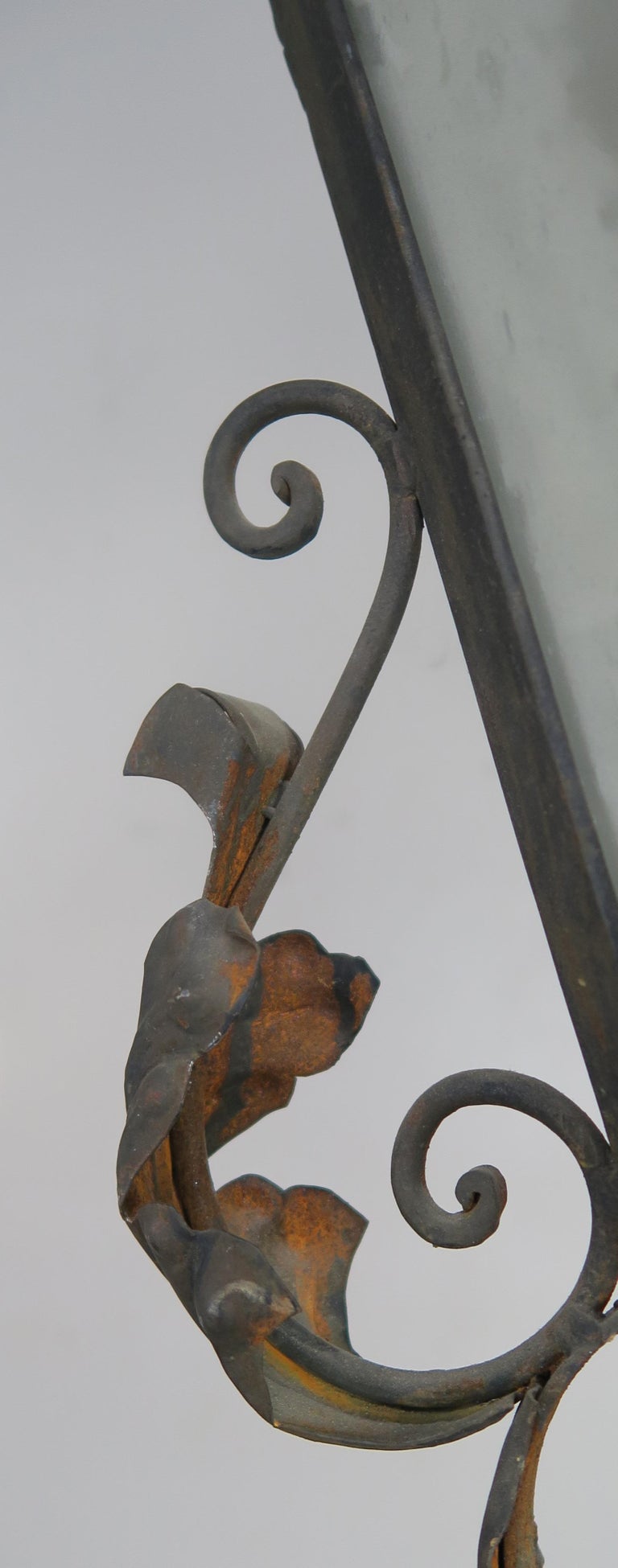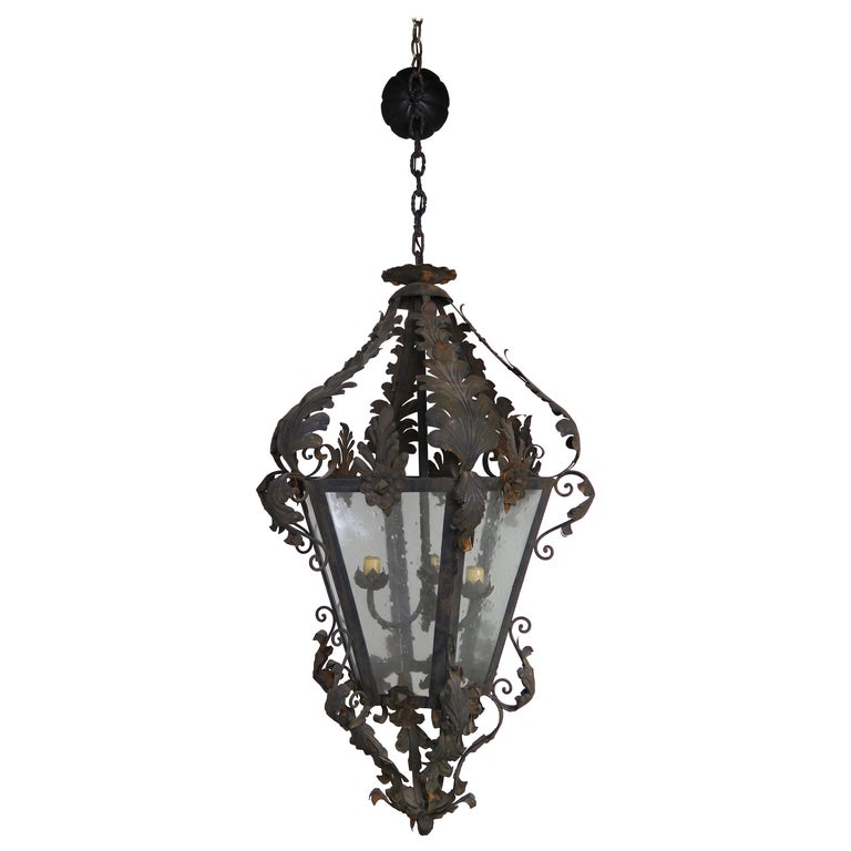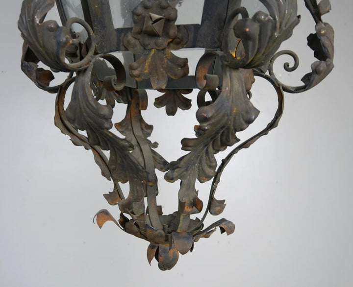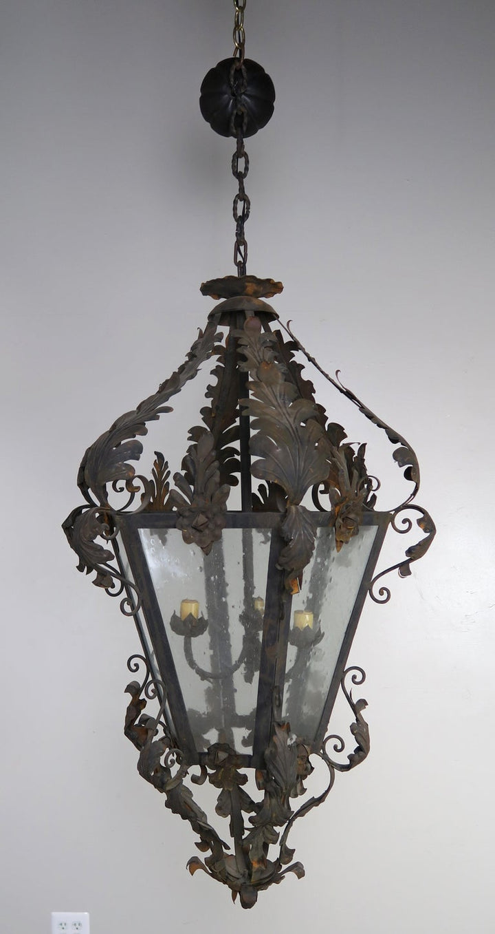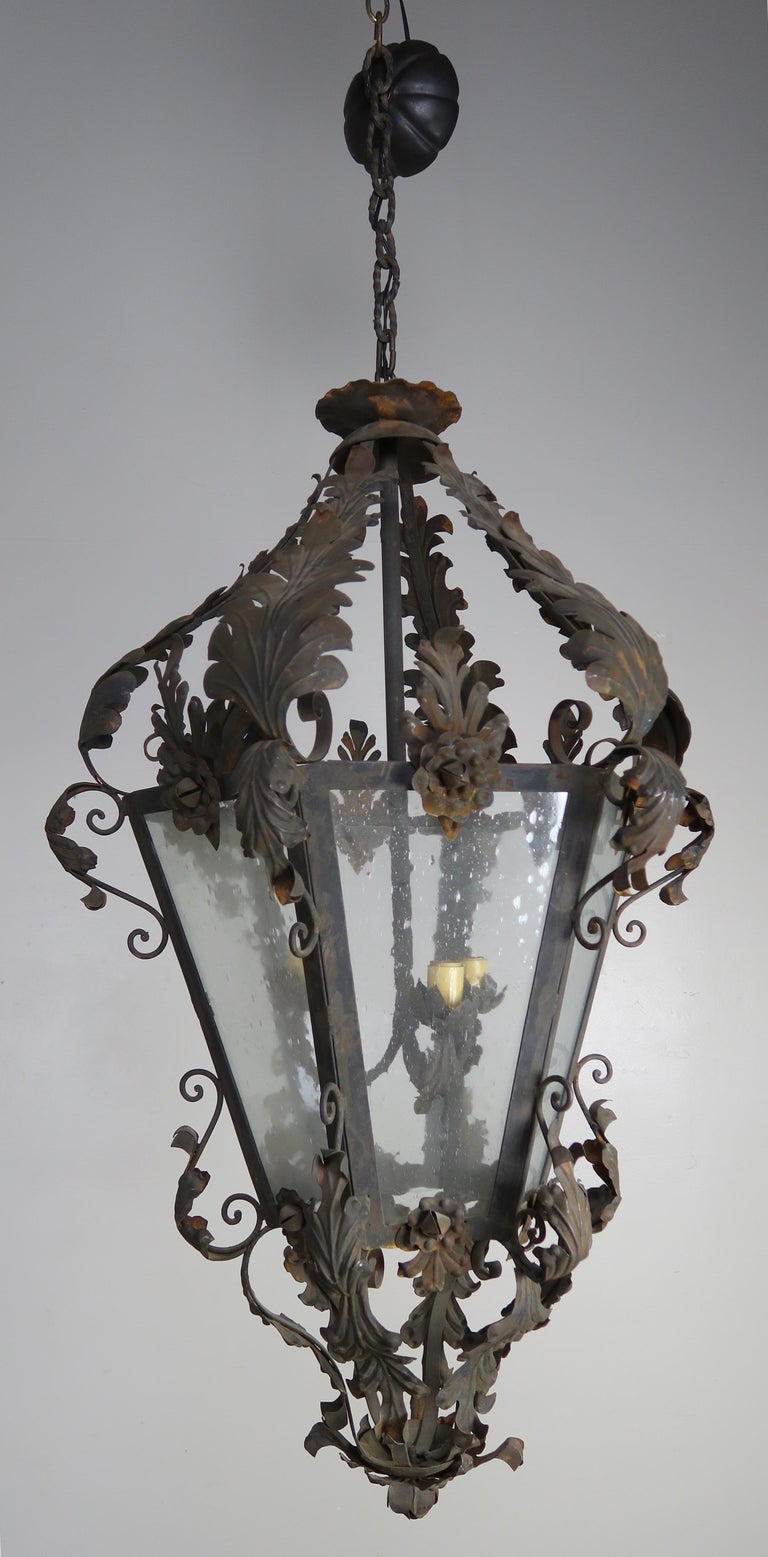 Spanish wrought iron and reeded glass 3-light lantern with acanthus leaves and roses though out. Original vintage finish.