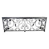 Spanish console that features a wrought iron base with an intricate scrollwork design.  The ironwork includes elegant curves and decorative elements like leaf motifs, giving it a traditional or Old-World aesthetic.  The black finish adds a bold and classic touch, making it a statement piece for any interior or outdoor setting.